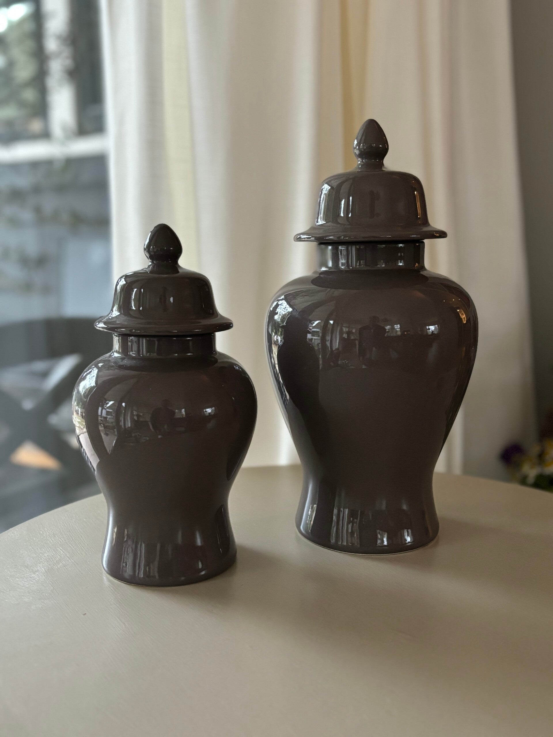 Twee dekselpotten in taupekleur. Meteriaal: Keramiek.