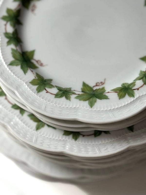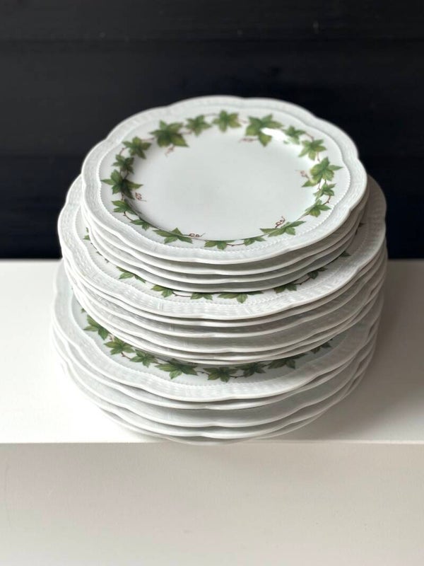 Set of 15 plates with a hedra border. The set includes 4 breakfast plates, 6 soup plates, and 5 dinner plates.