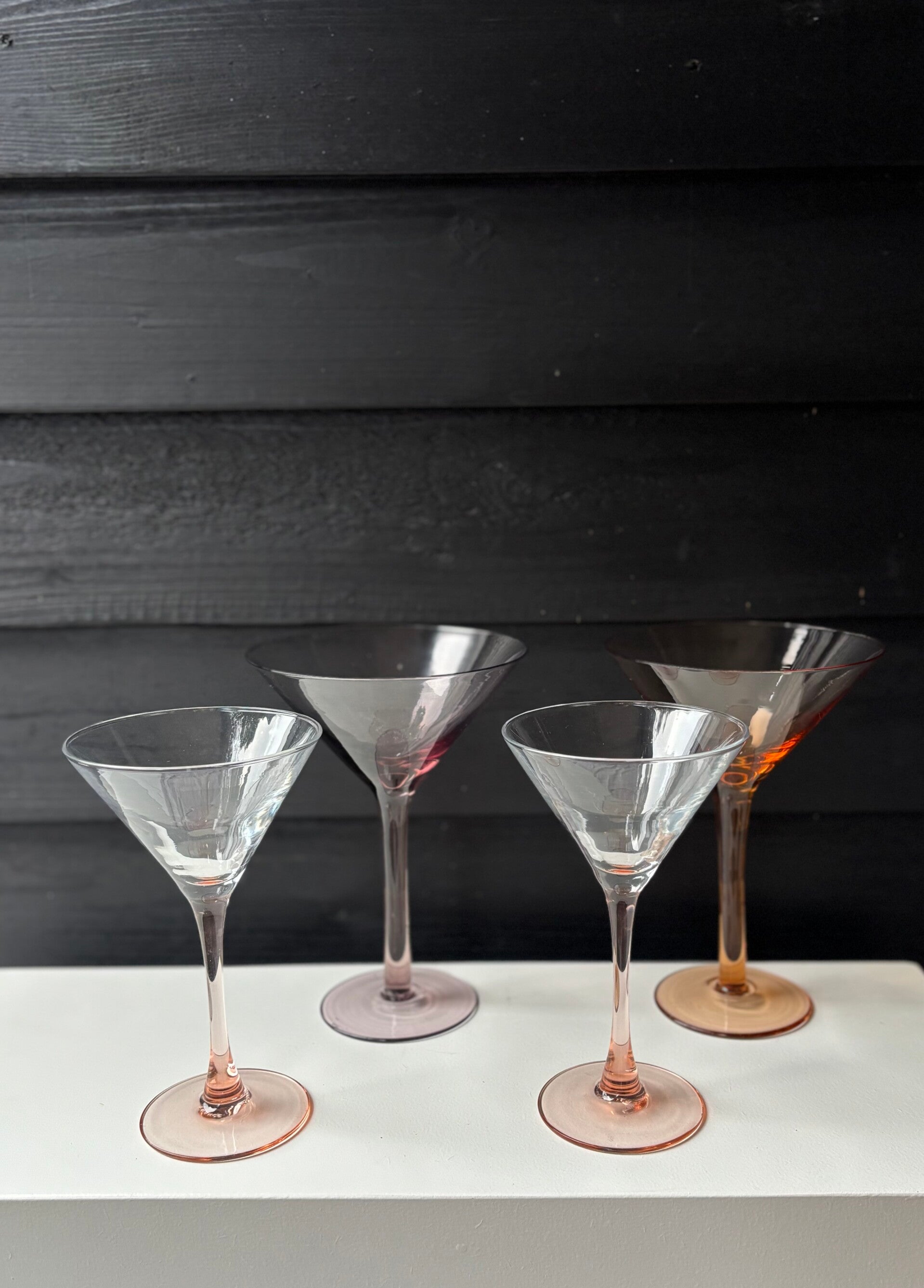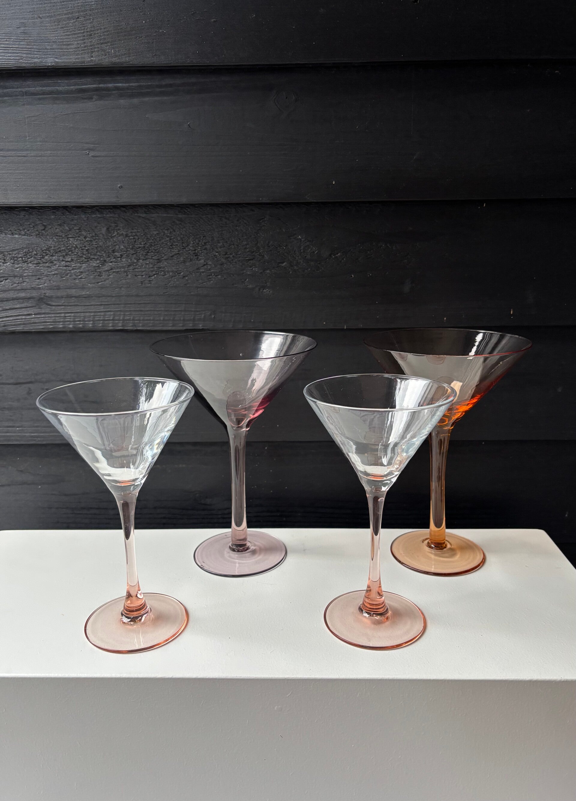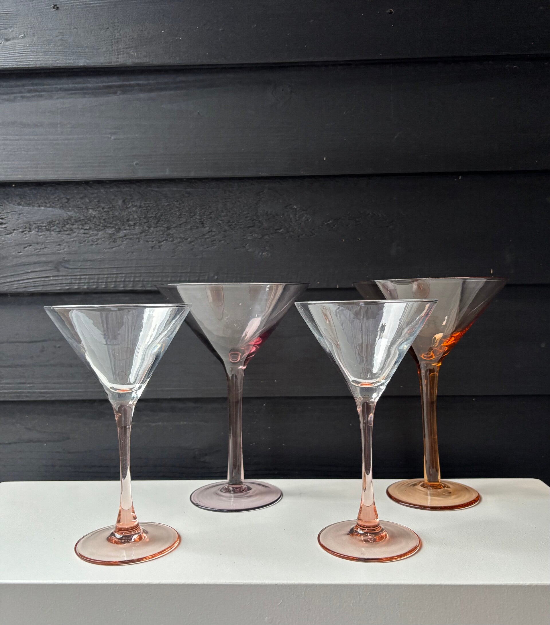 Set van 4 cocktailglazen. 2 Glazen met slanke roze voet zijn van Luminarc. De andere twee glazen hebben een stevige voet.