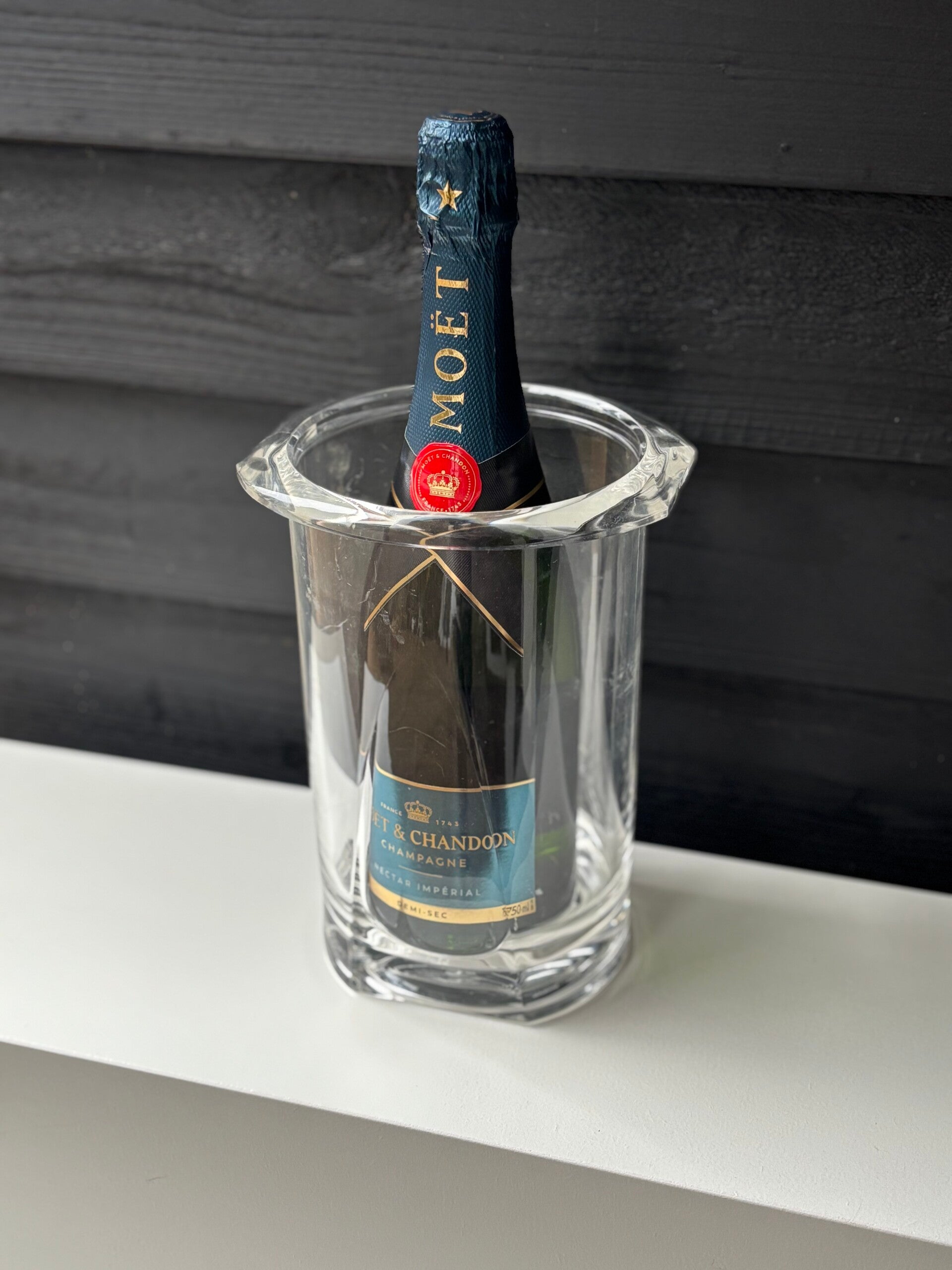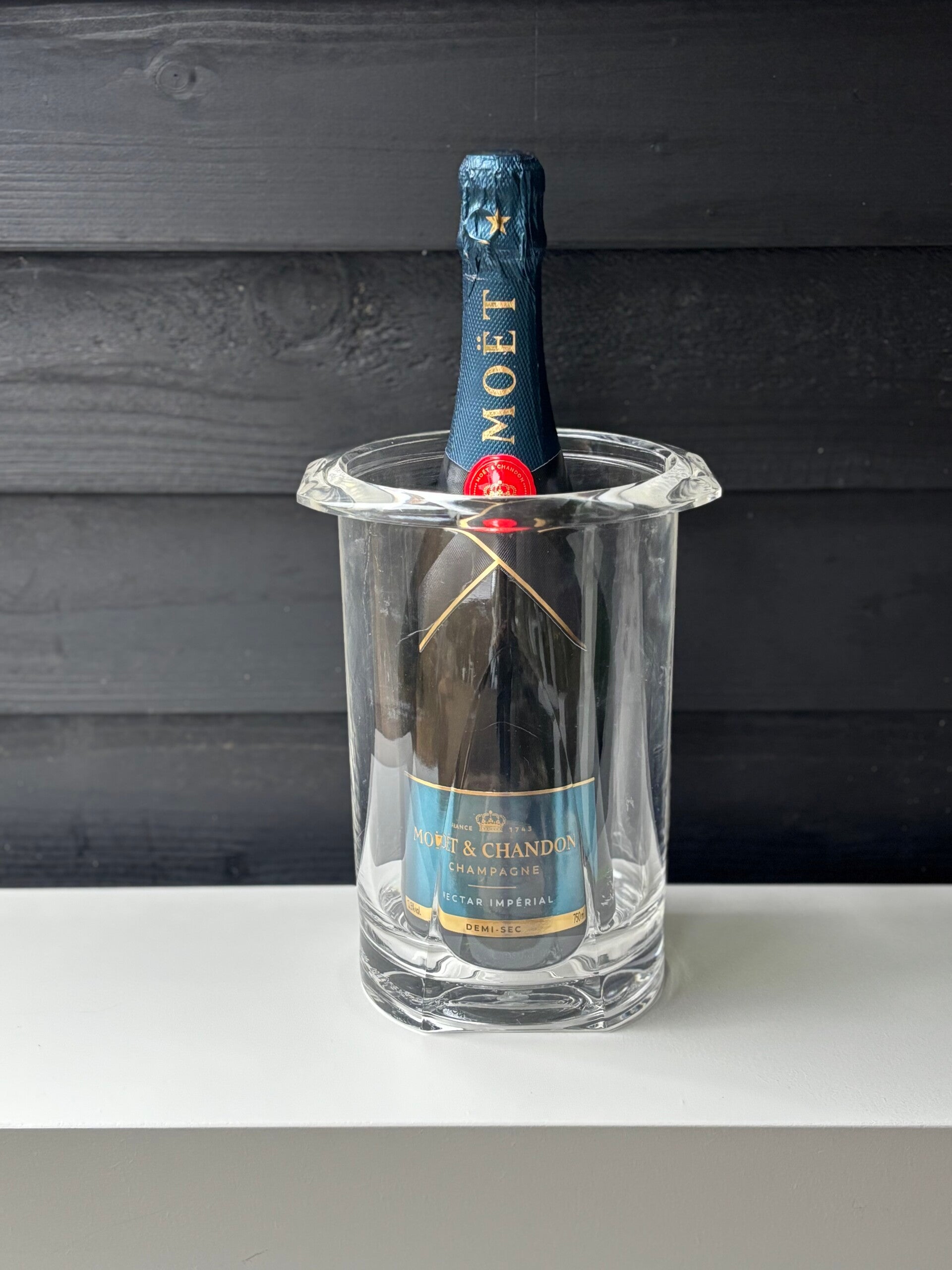 Transparante wijnkoeler van acryl. Hoogte: 22 cm.