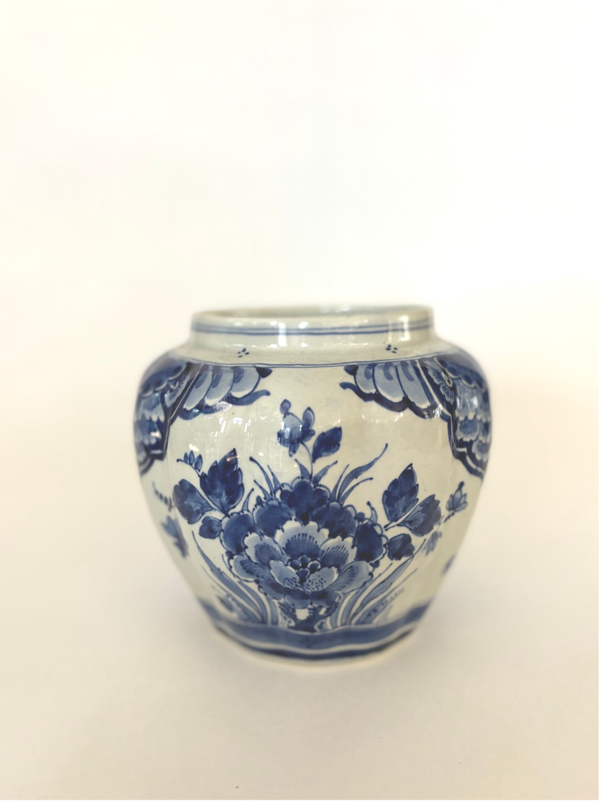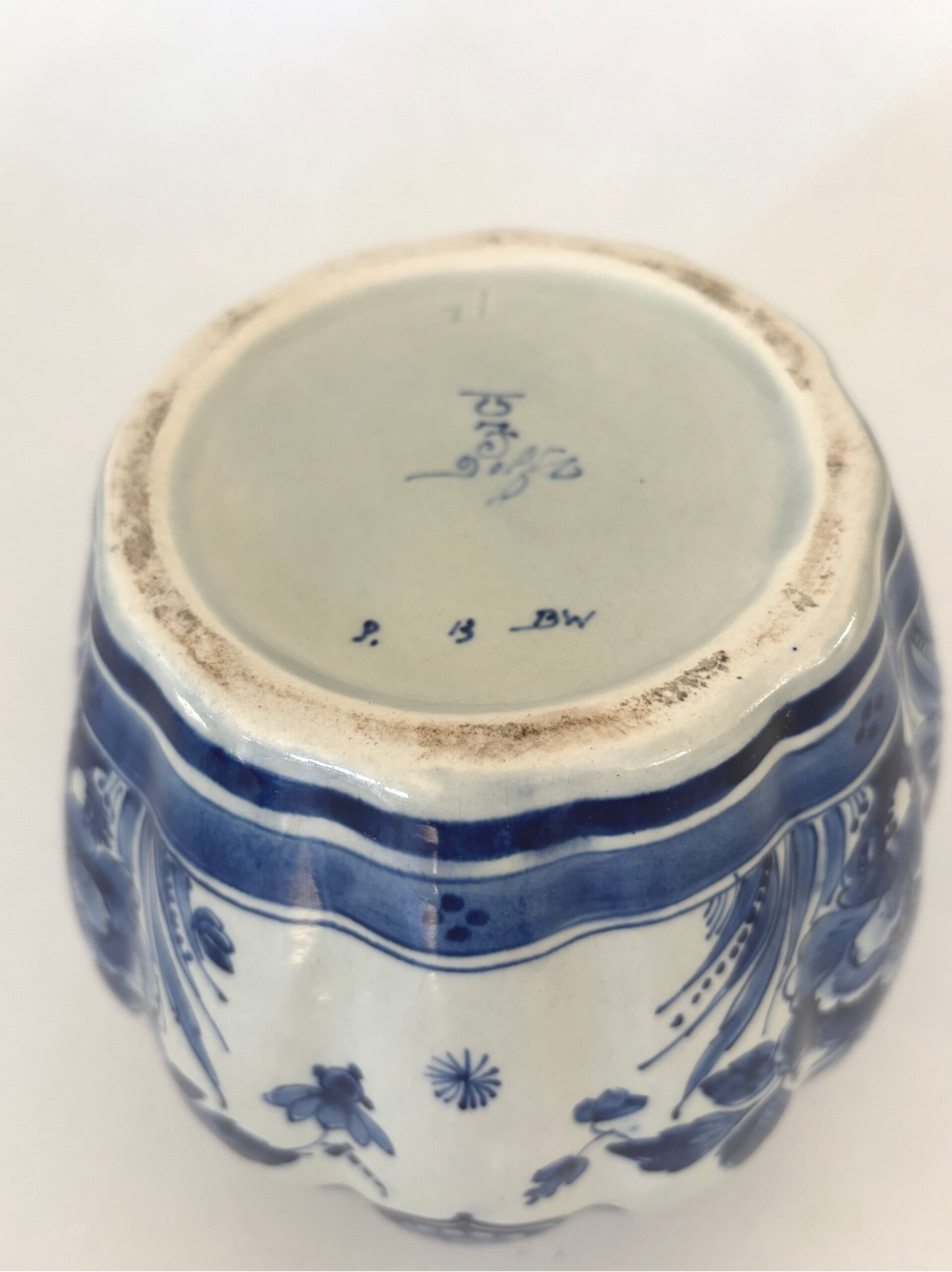 Hand-painted flower pot 'Delfts'. Marked on the bottom 'B.W.' Royal Delft porceleyne. Height: 15 cm. Width: 17 cm. This hand-painted jar was crafted around 1952.