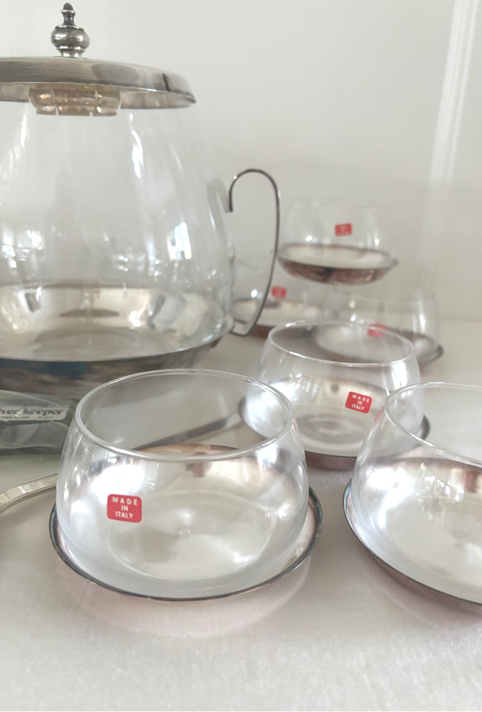 14-Delig verzilverde Punch-bowl set. Vervaardigd in Italië. Deze schitterende set bestaat uit 12 glazen punchglazen met verzilverde onderzetters, een punch-bowl met deksel, een opscheplepel en een silver keeper van Hagerty.