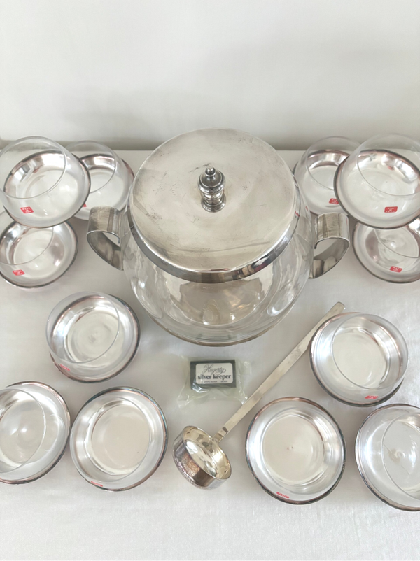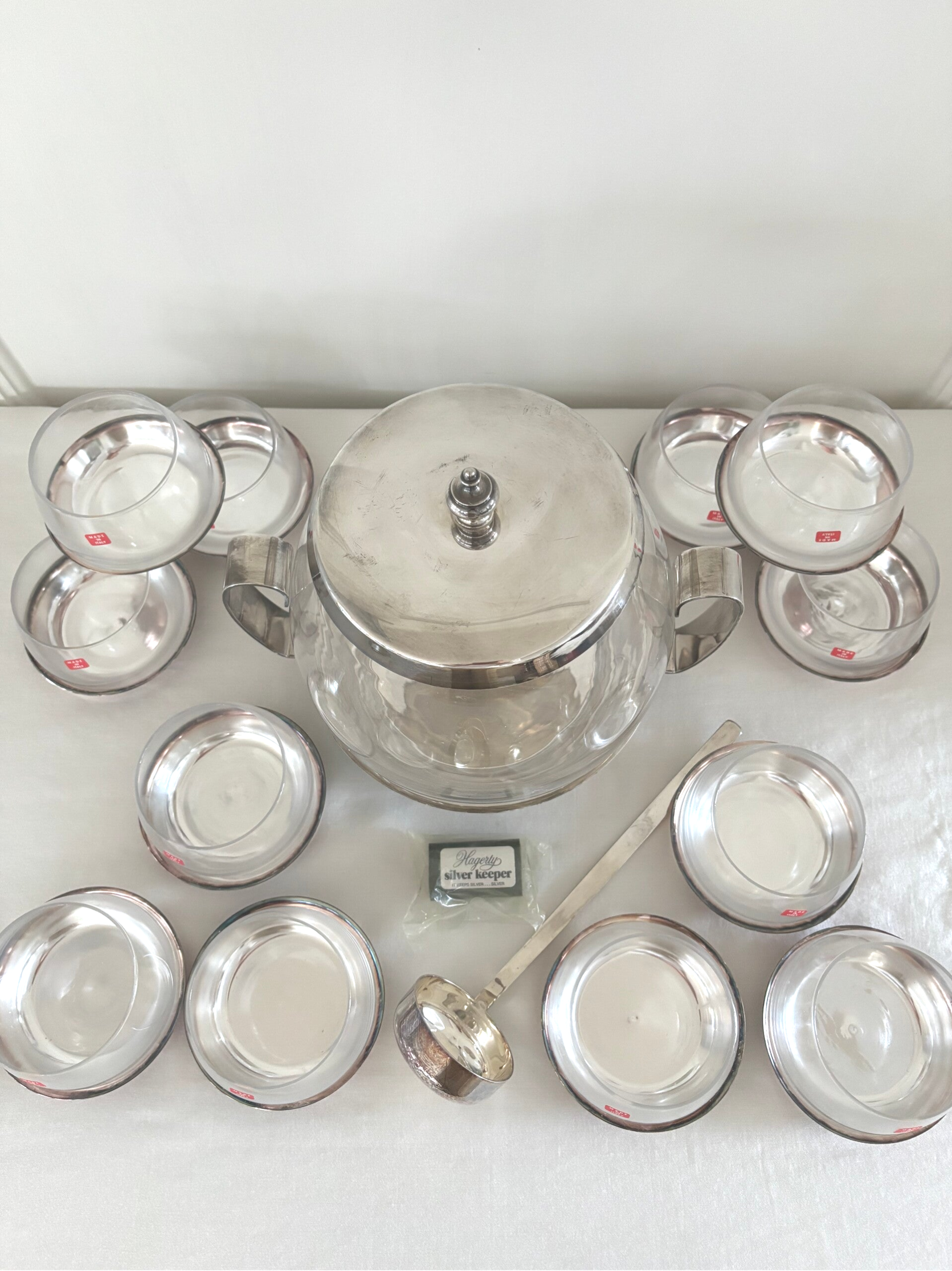 This stunning set includes 12 glass punch cups with silver-plated coasters, a punch bowl with a lid, a serving ladle, and a silver keeper from Hagerty.