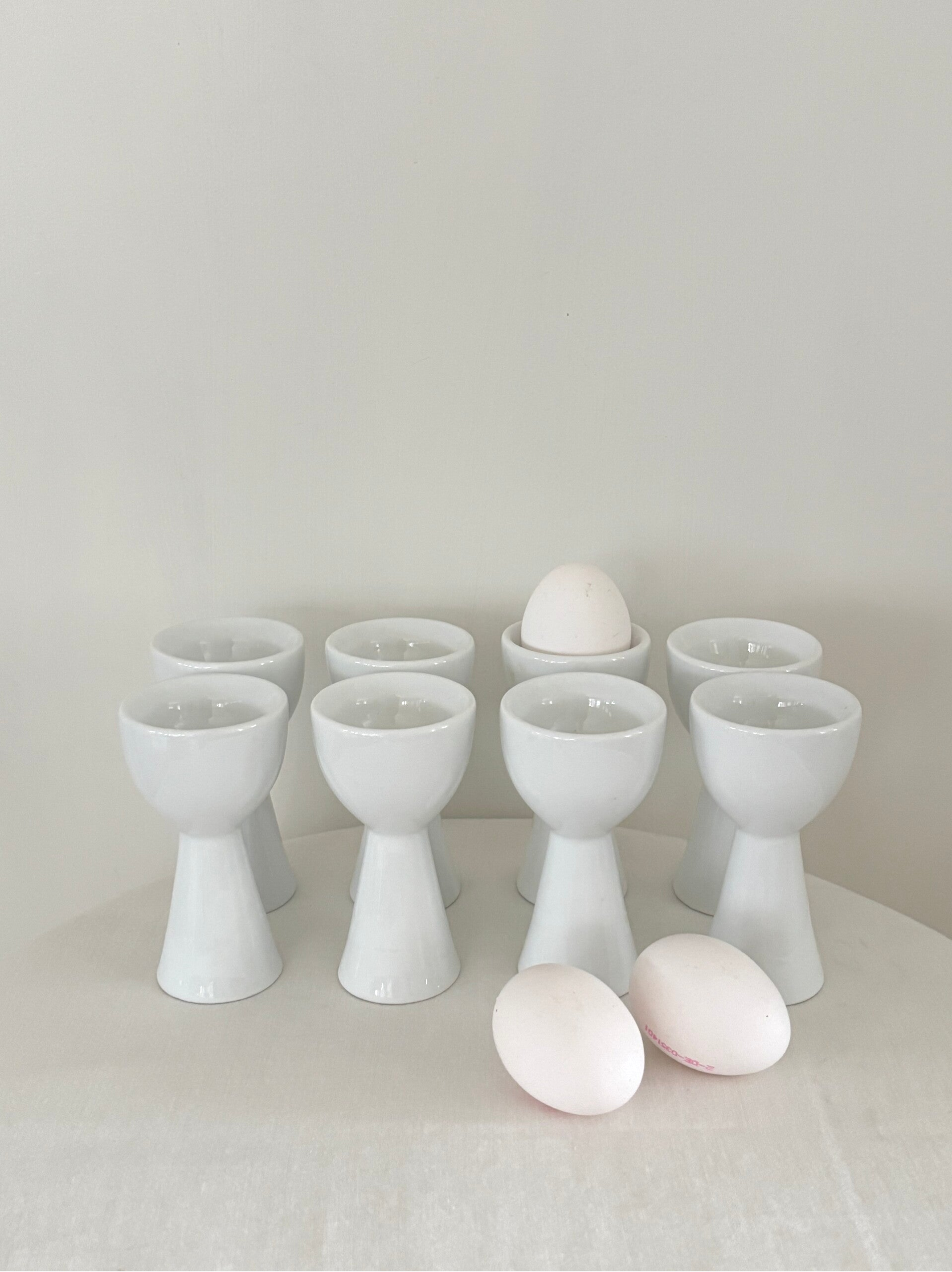 Set van 8 eierdopjes. Materiaal: keramiek.