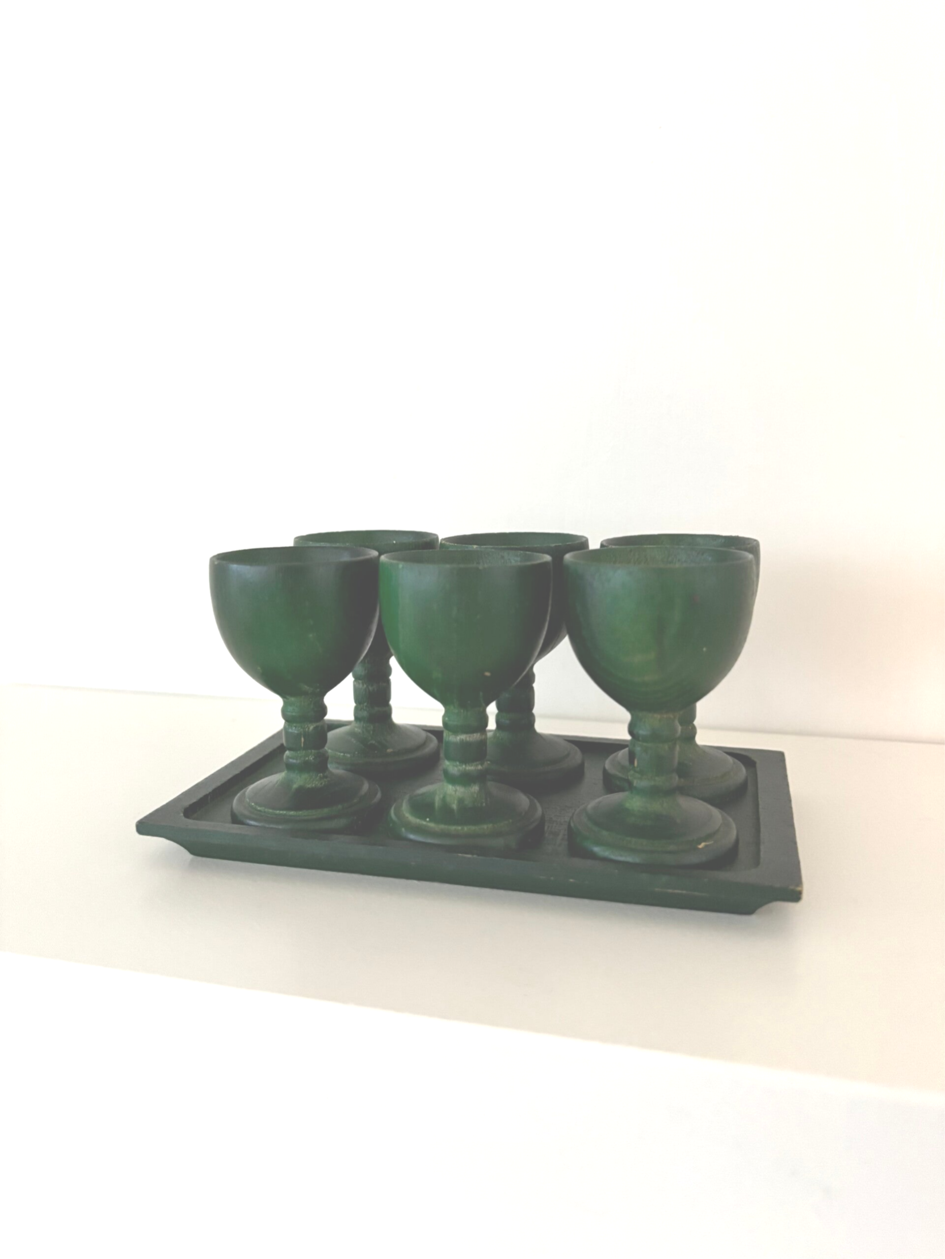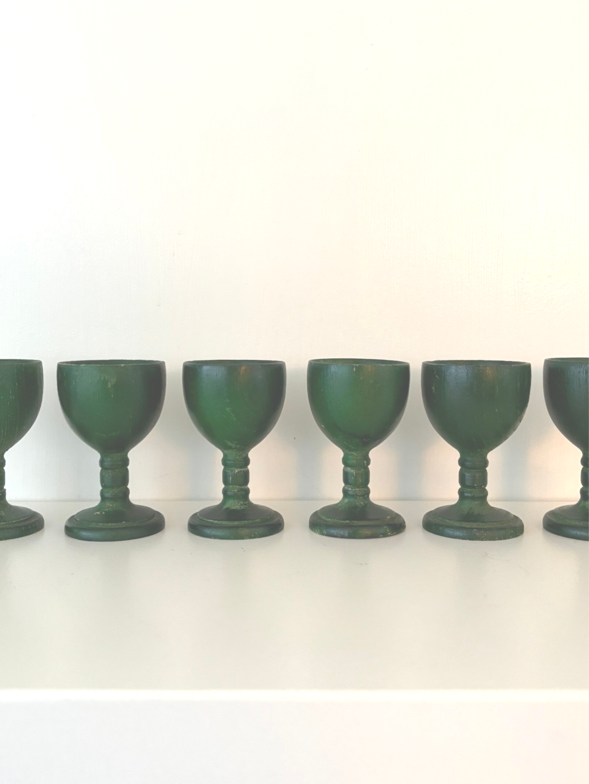 6 Groene eierdopjes uit de 70s. Materiaal: hout.