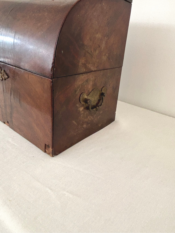 Antique small liqueur cabinet with 6 bottles and two glasses. The liqueur cellar was made in the early 19th century. Dimensions: 26.5 x 18 cm. Height: 25 cm. Material: Oak wood and mahogany veneer. All bottles are in good condition. A true eye-catcher!