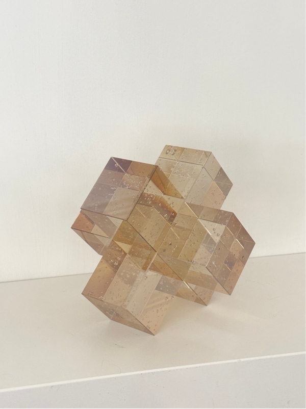 Glazen kunstobject. Afmetingen: 14,5 x 15 cm. Kleur: Champagne. Er is ook een kleiner model beschikbaar op deze site.