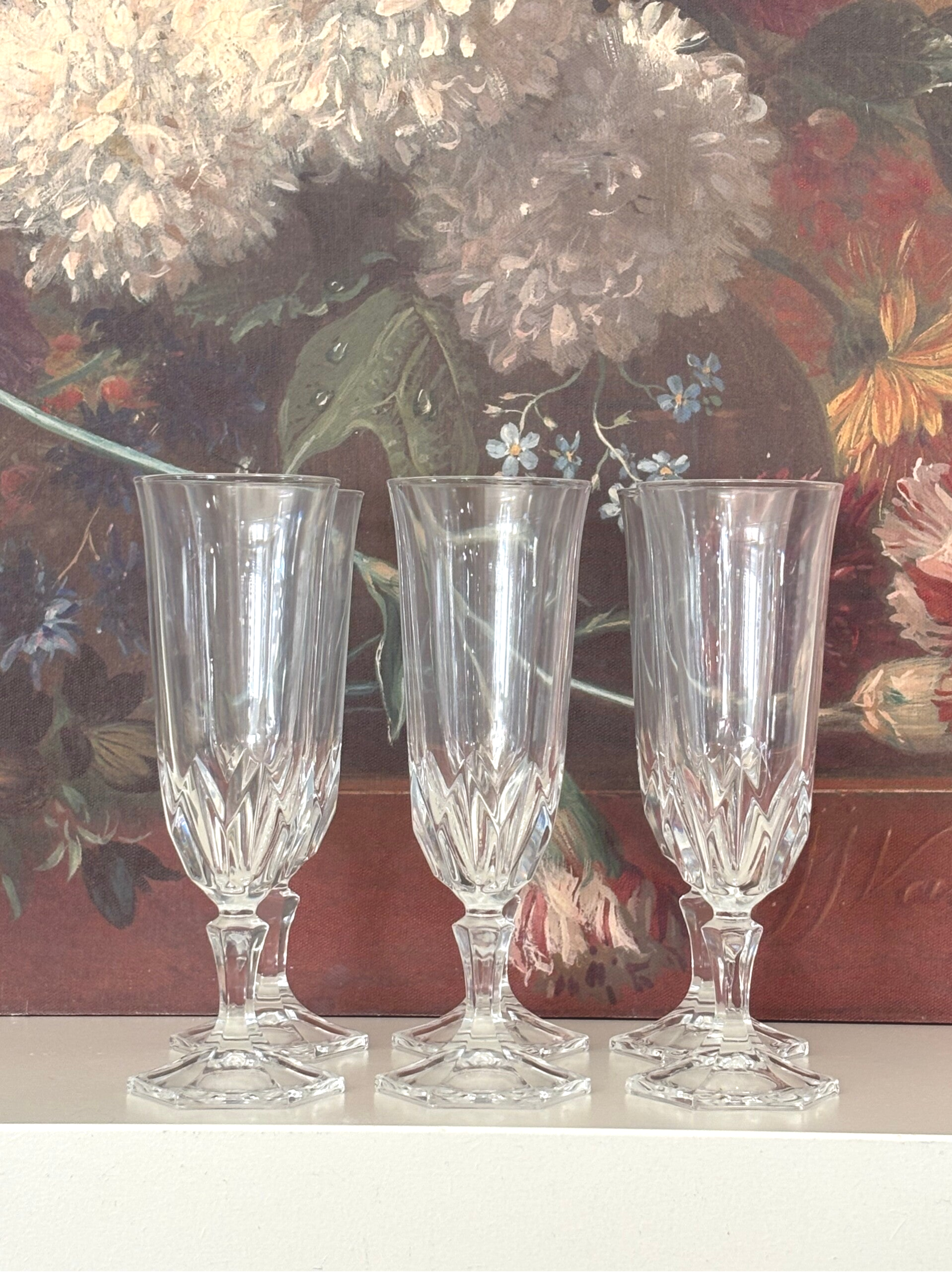 Set of 6 crystal champagne glasses from the 'Chaumont' series by Cristal D'Arques. Made in France. The glasses are in mint condition.