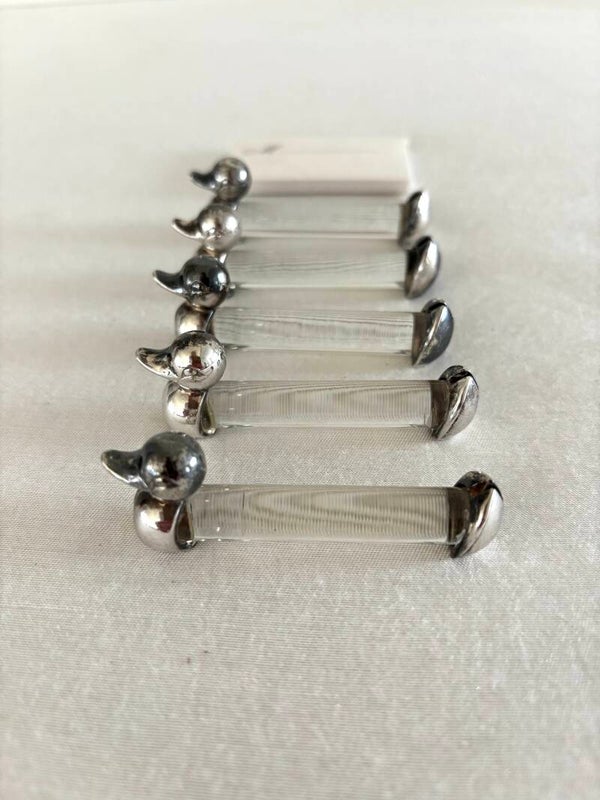 5 Verzilverde messenleggers/naamkaarthouders. Lengte: 6,5 cm.