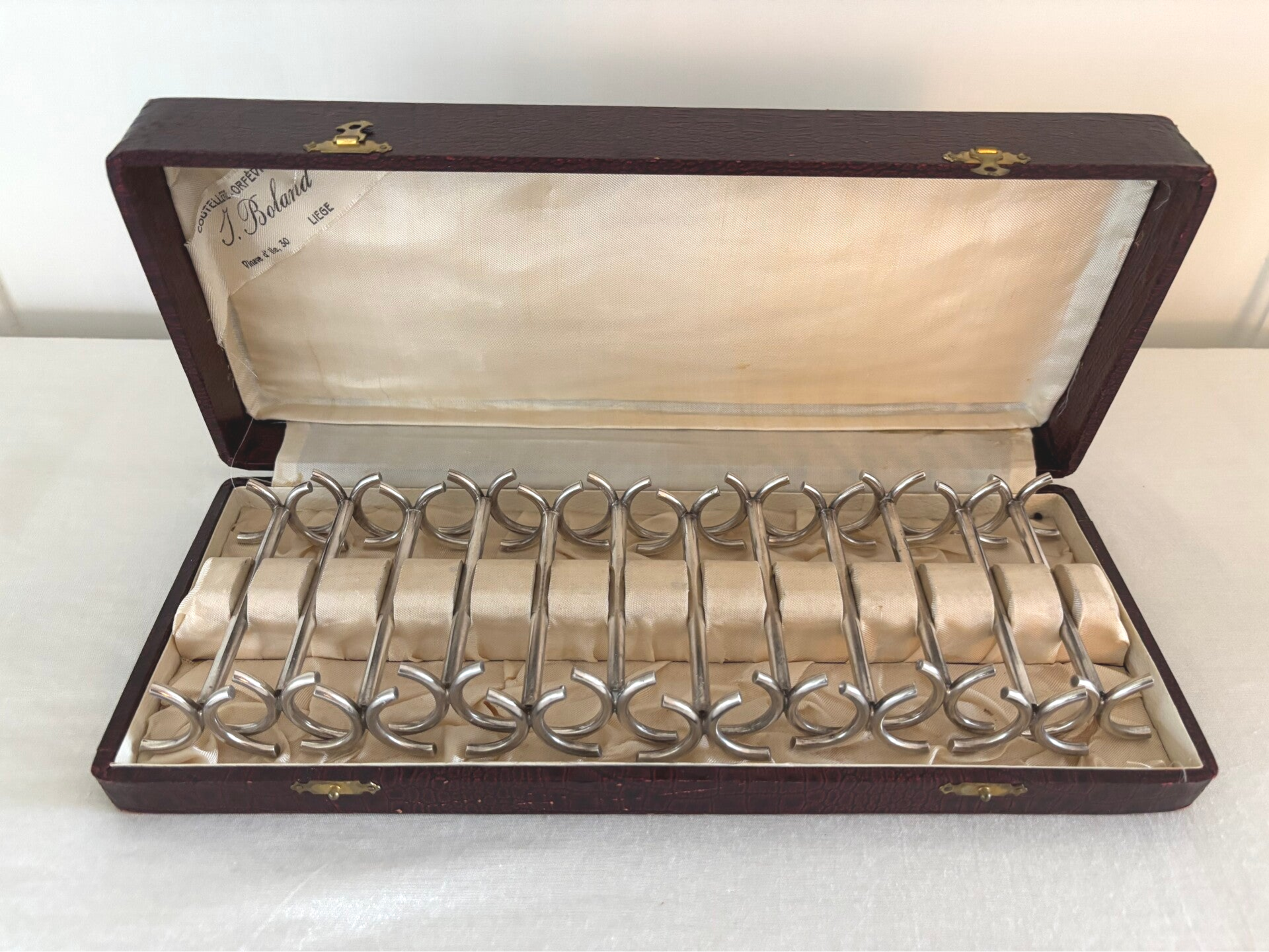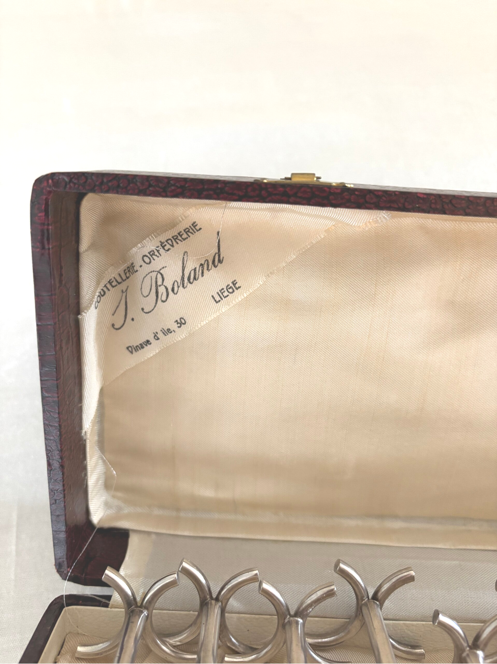 12 Verzilverde antieke messenleggers van Coutellerie Orfrèvrerie J. Boland, Liège. De messenleggers zijn in perfecte conditie.