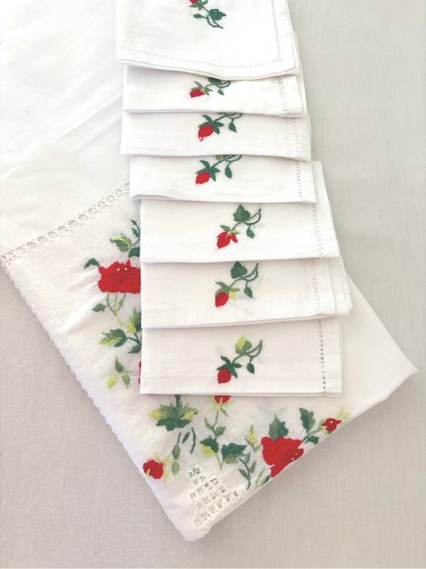 Embroidered vintage tablecloth, approximately 180 x 128 cm, and 8 embroidered napkins.