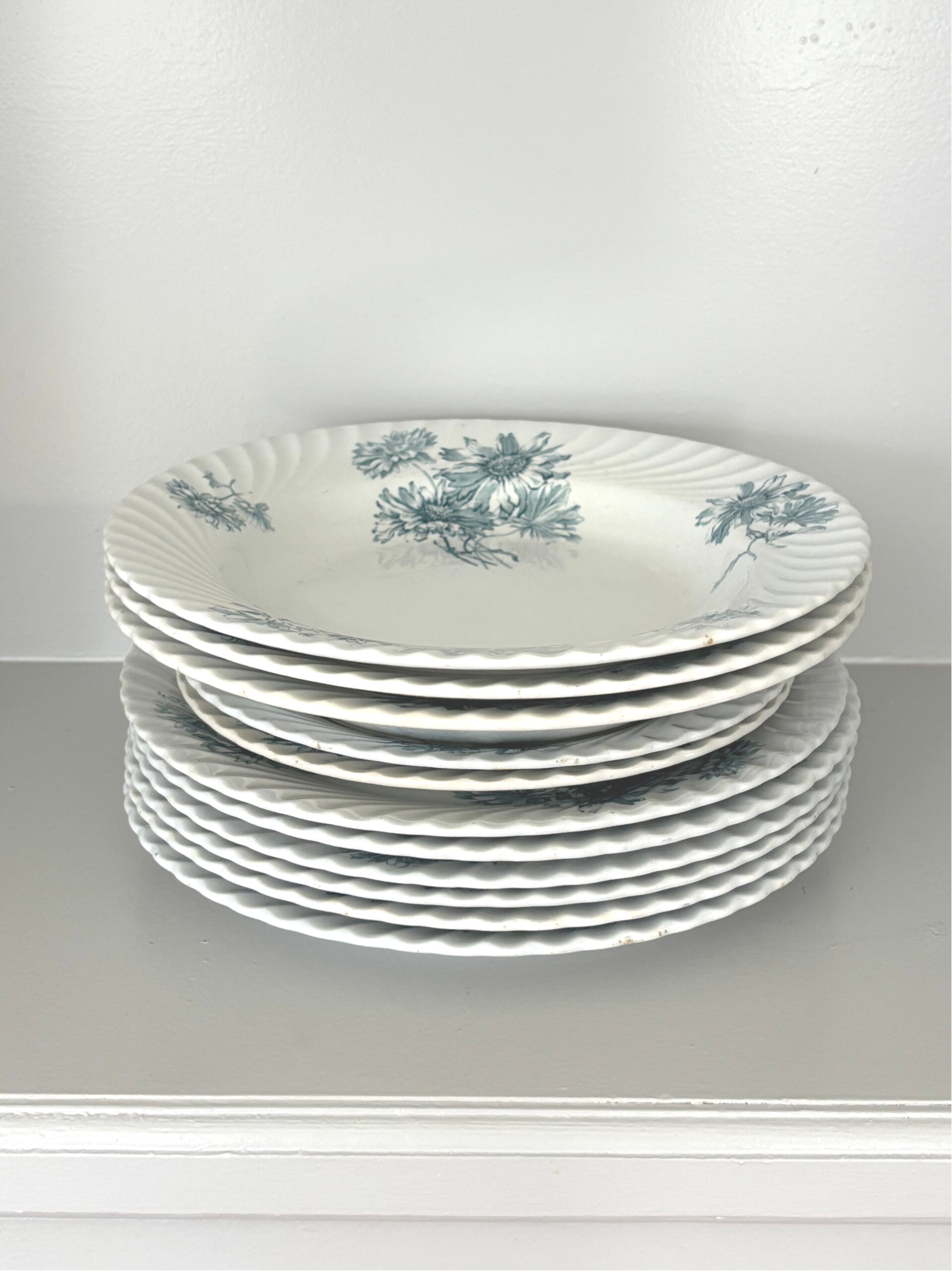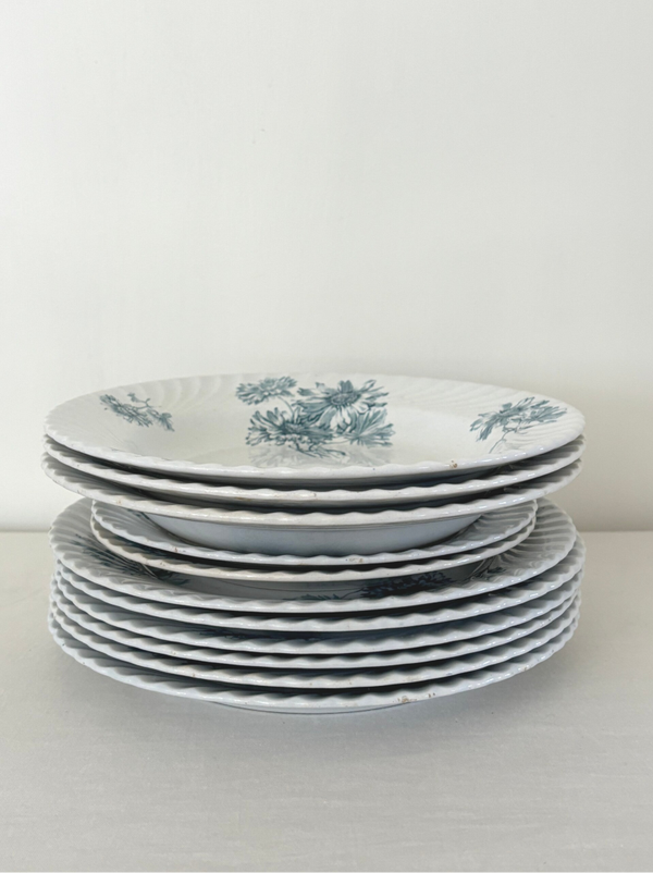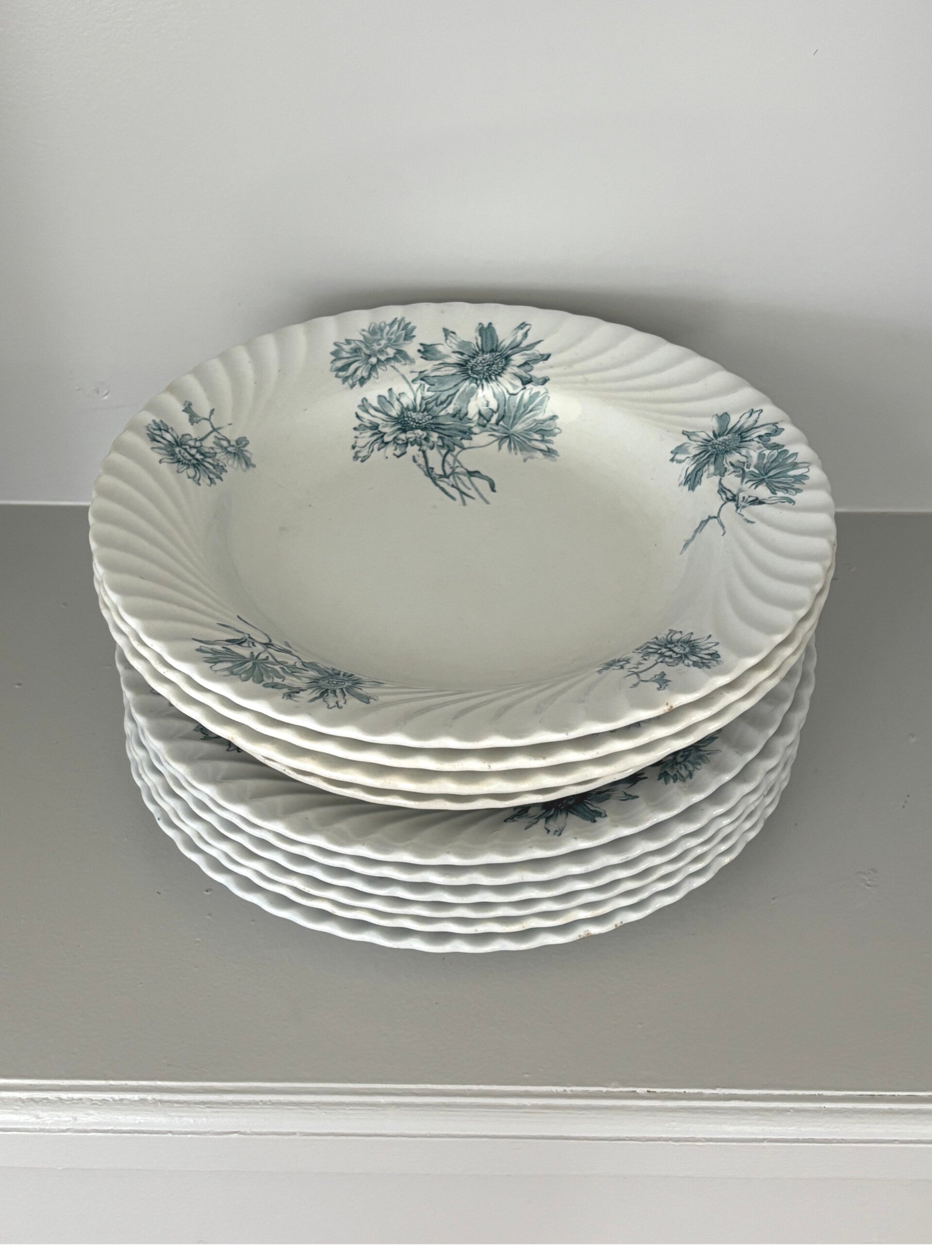 11-Delige set borden 'Pinksterbloem' Petrol van Petrus Regout. De set bestaat uit 3 diepe borden, 2 borden (diameter: cm) en 6 borden ( diameter: cm). Het is een oud servies, er kunnen minimale beboterde plekjes of lichte craquele onder het glazuur aanwezig zijn.