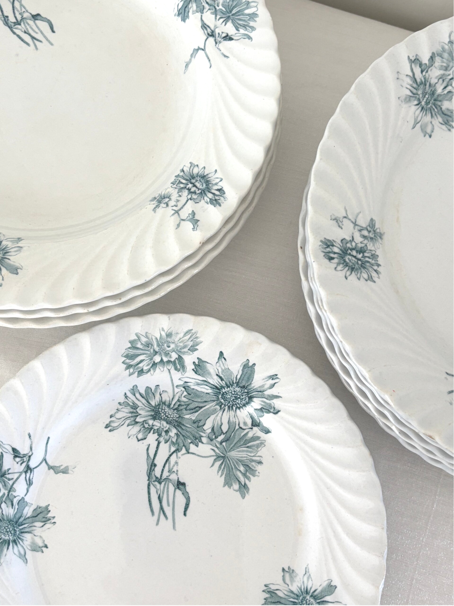 11-Piece set of plates 'Pinksterbloem' Petrol by Petrus Regout. The set consists of 3 deep plates, 2 plates (diameter: cm), and 6 plates (diameter: cm). It is an old tableware set, so there may be minimal butter stains or light crazing under the glaze.