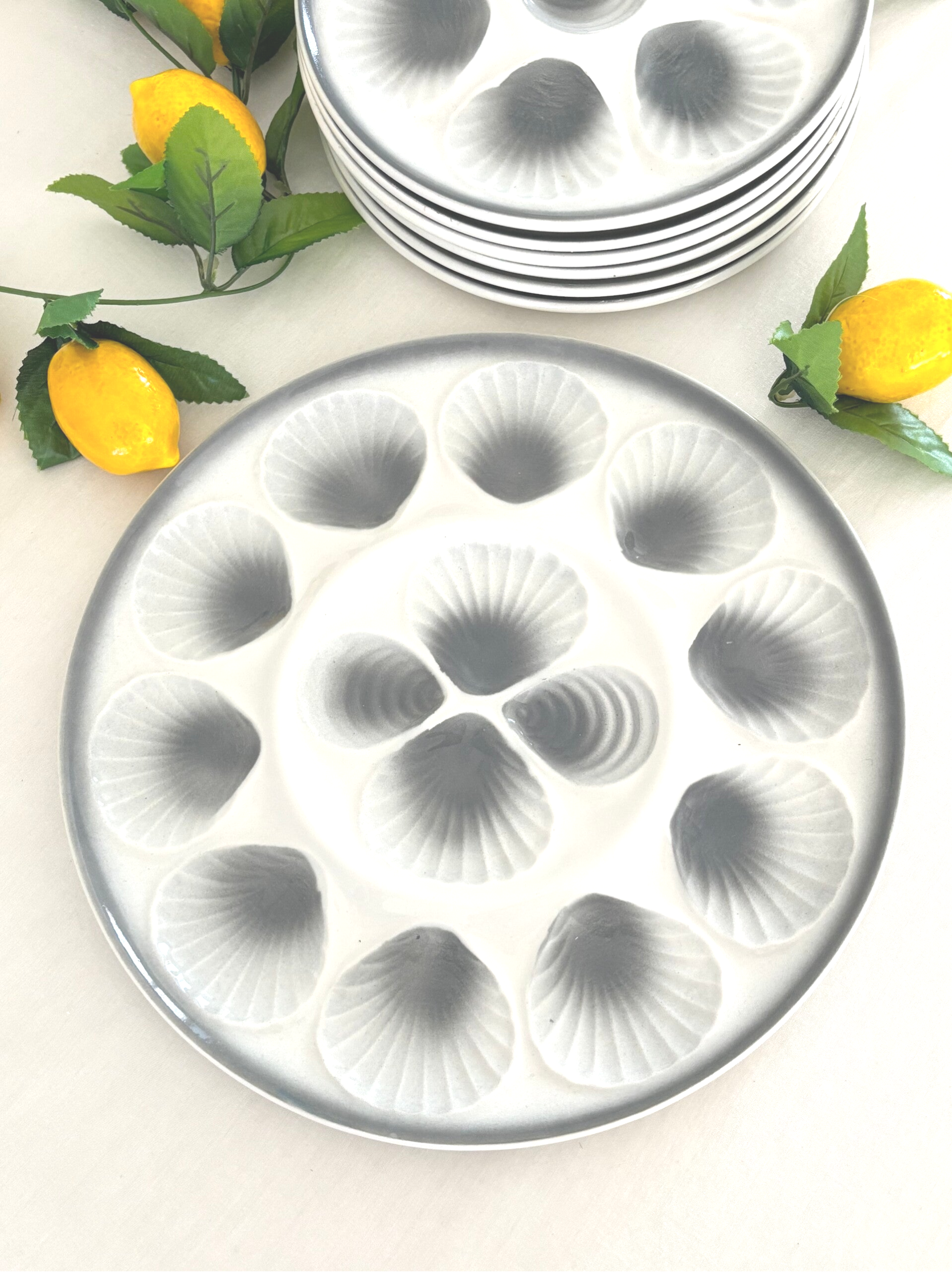 Set of 1 large XL oyster plate and 6 oyster plates by Moulins des Loups. In very good condition. Color: grey.