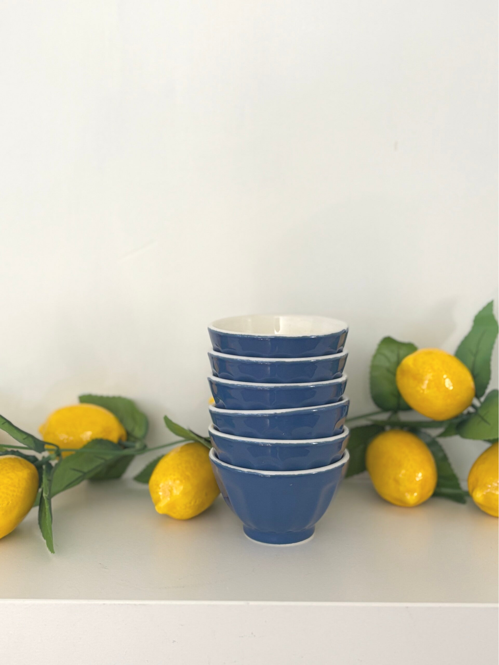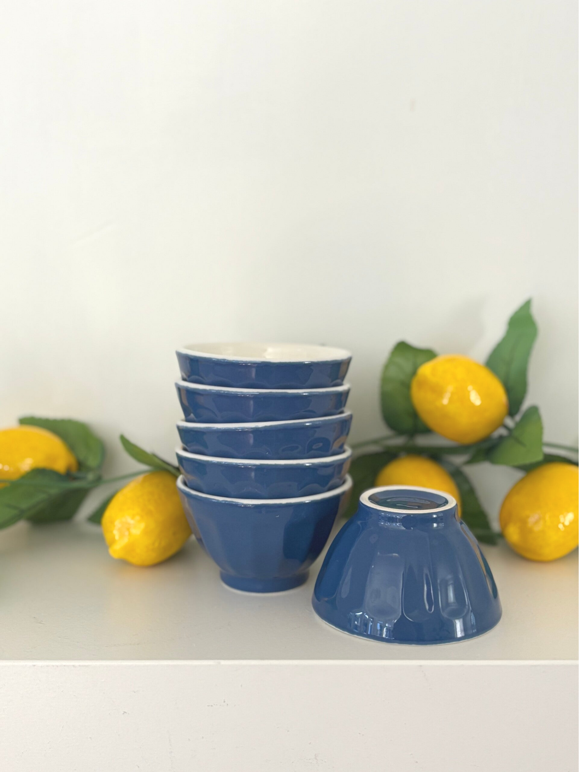 Set van 6 keramieken kommetjes in een diepe blauwe kleur. Perfect voor een kleine gerechtje, desserts, dips of snacks. Diameter: 8,5 cm. Hoogte: 5 cm.