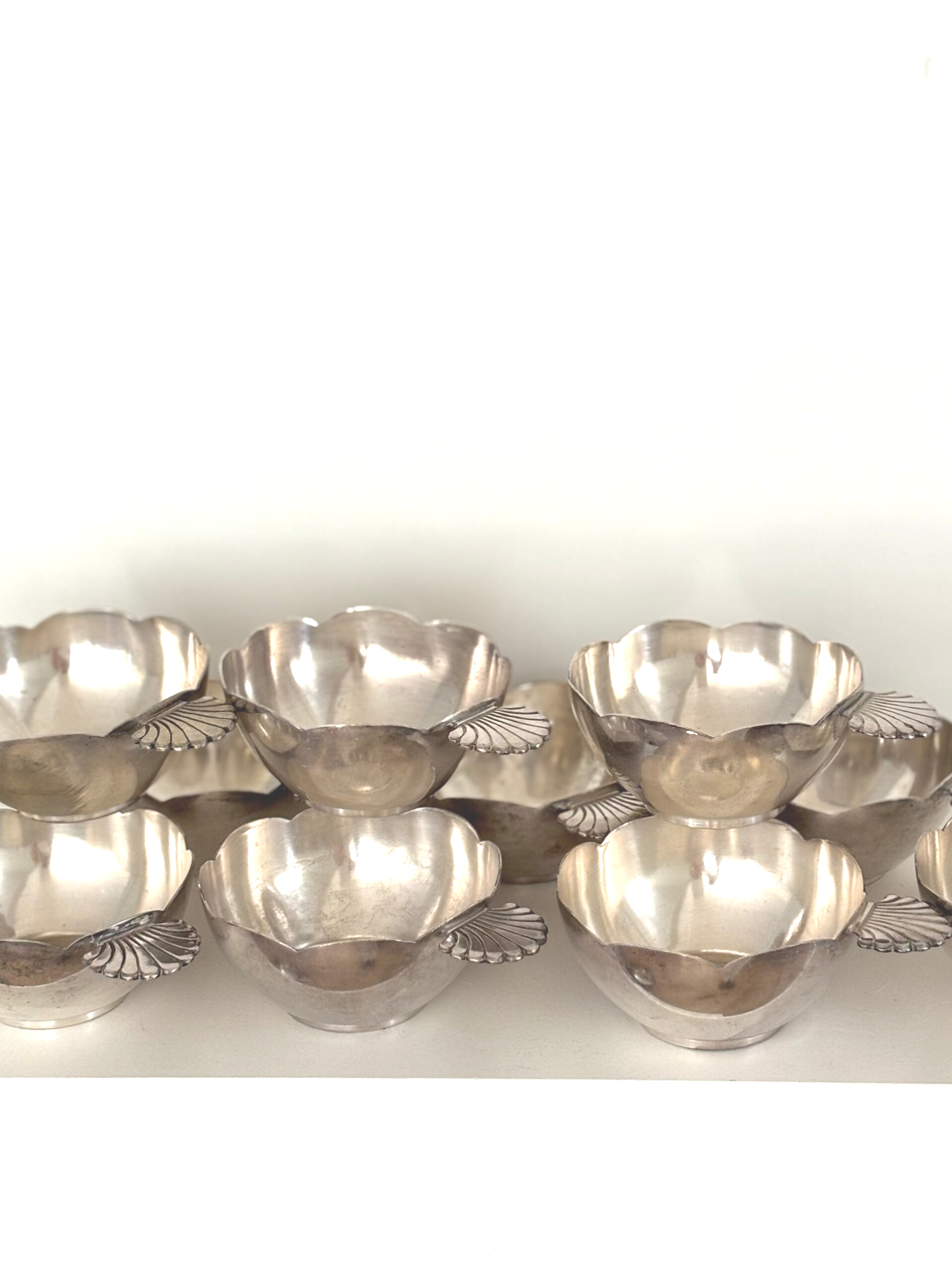 Schitterende set van 10 verzilverde dessertschaaltjes met handvat in schelpvorm. Gemerkt onder het handvat, o.a. met een cornet. Elegantie en vakmanschap uit België! Diameter schaaltje: 9 cm. Hoogte: 4 cm.