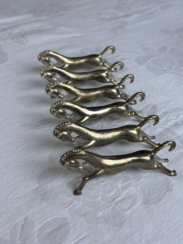 Elegant silver-plated knife rests shaped like horses. A stylish and practical addition to any table setting. Multiple sets available.