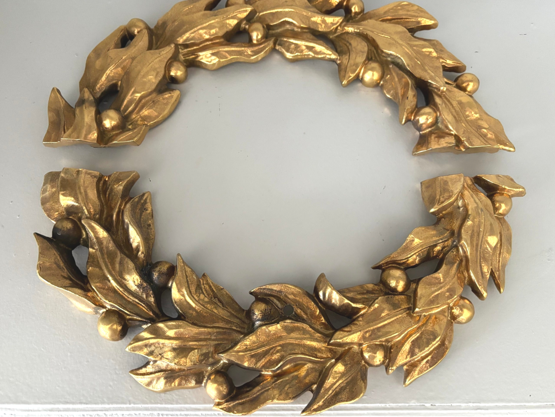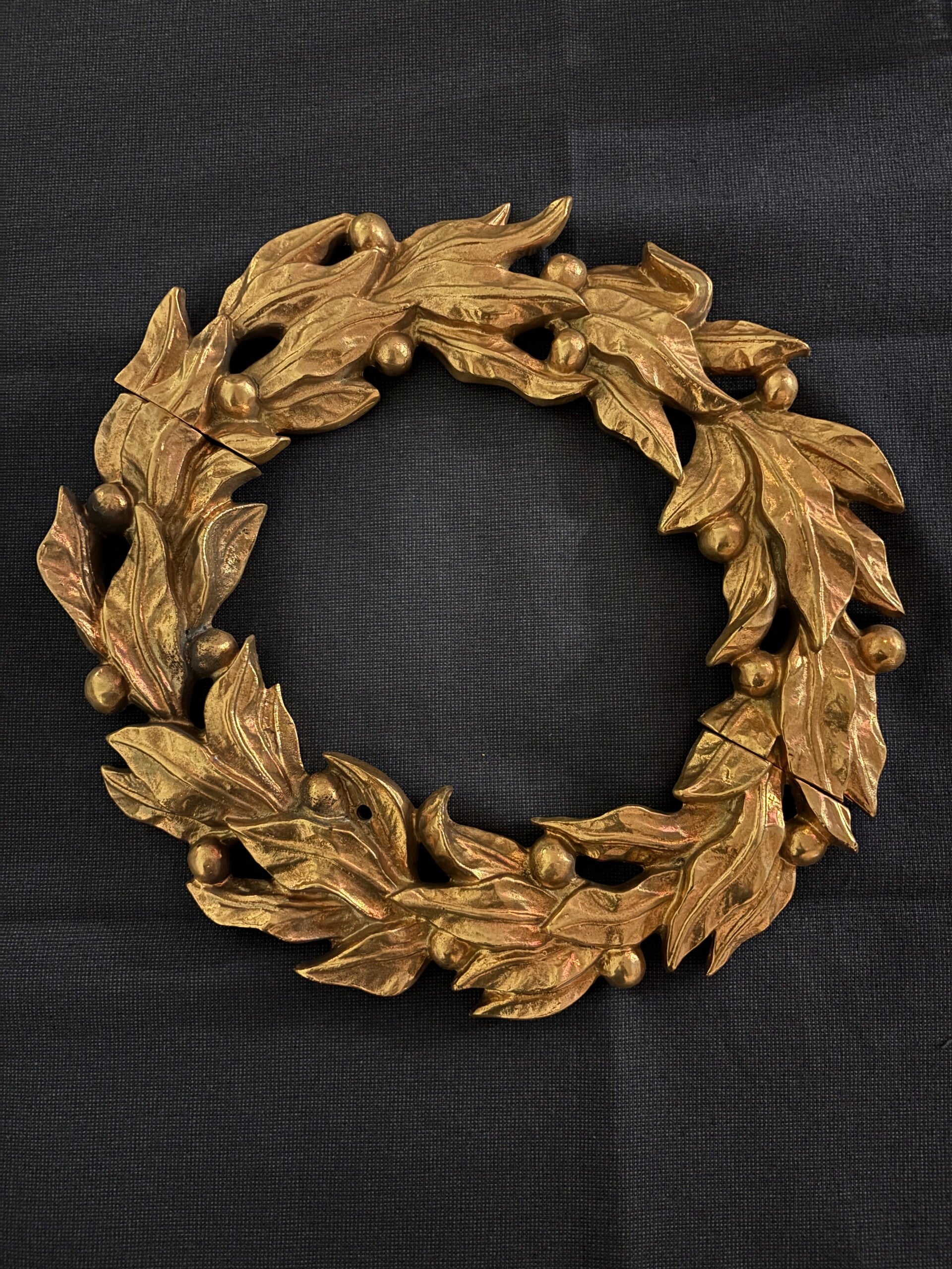 Add a touch of timeless charm to your home with this stunning cast metal wreath. Measuring 26.5 x 28.5, this heavy two-piece ornament is a true statement piece. Use it as a standalone centerpiece, incorporate it into your decor, or hang it for an eye-catching effect.