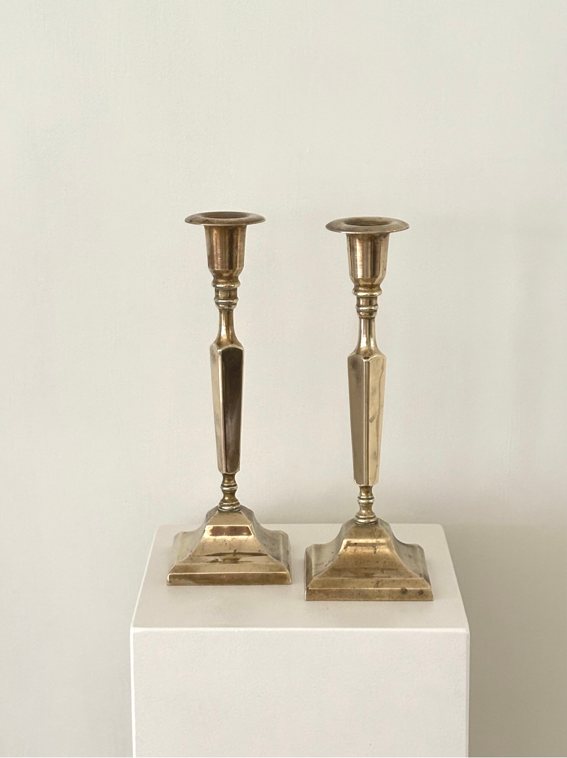 Timeless set of brass candle holders with elegant design. A warm touch for any interior. Height: 22.7 cm.