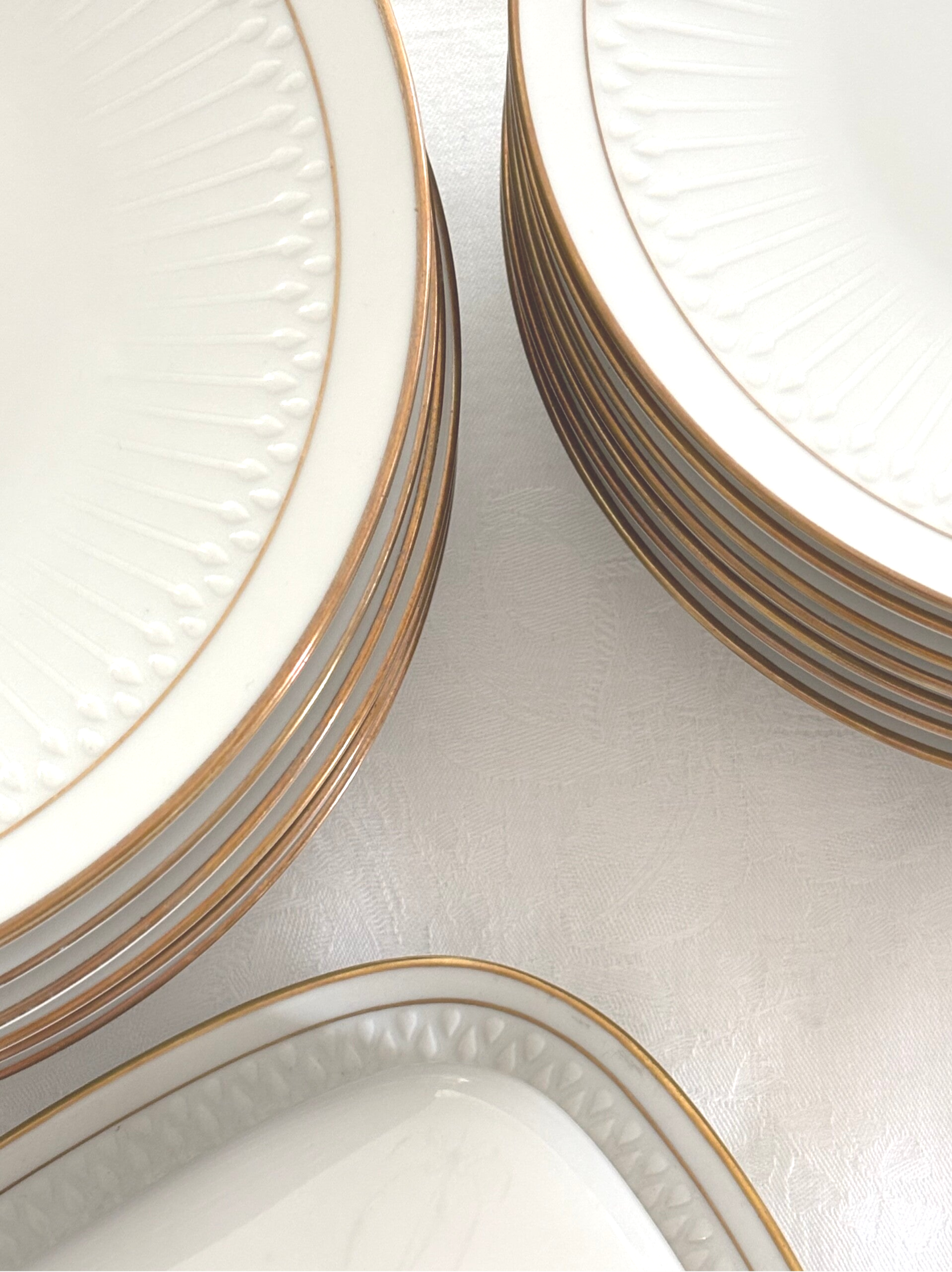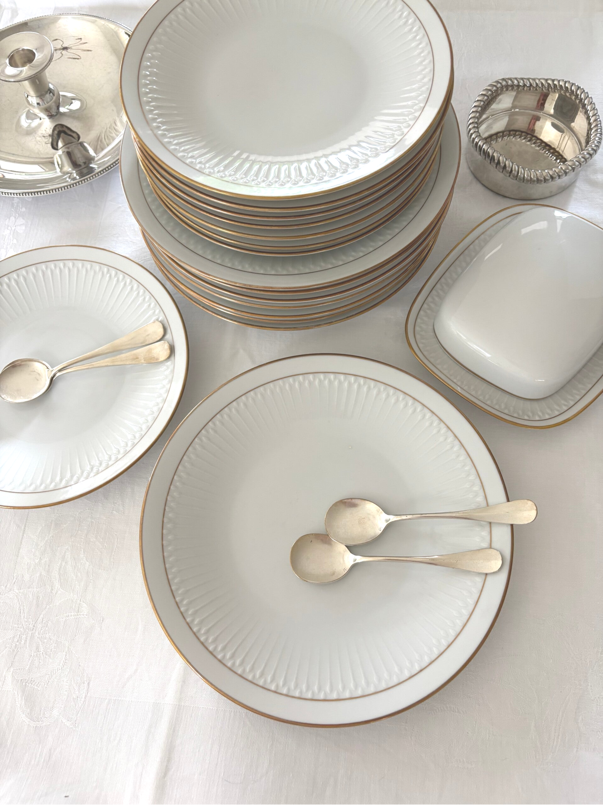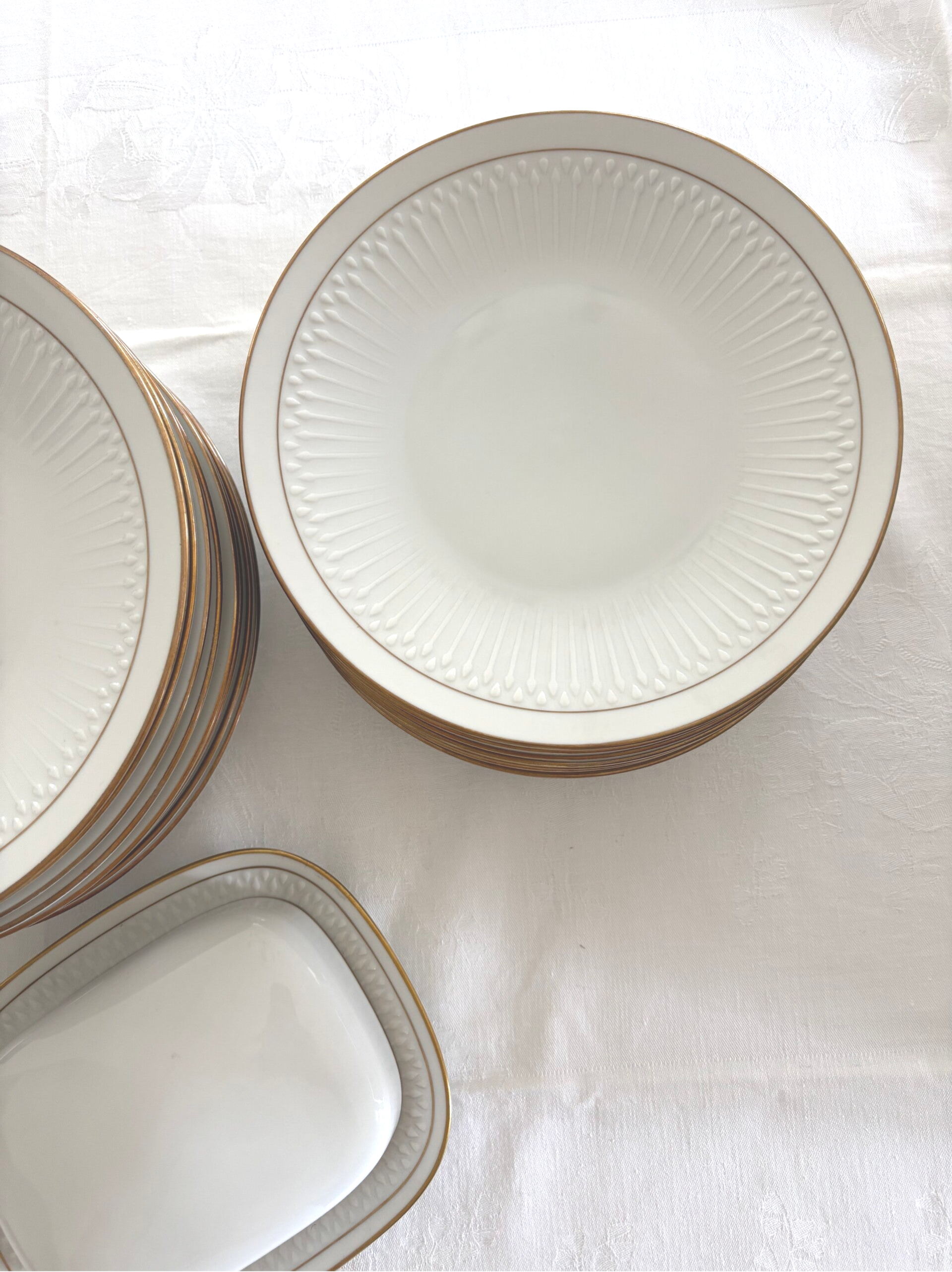 17-piece porcelain set in the "Luxor Gold" pattern by Hutschenreuther. Includes 8 breakfast plates (21.5 cm), 8 dinner plates (24.5 cm), and a butter dish. Embossed border with refined gold trim, a timeless classic.