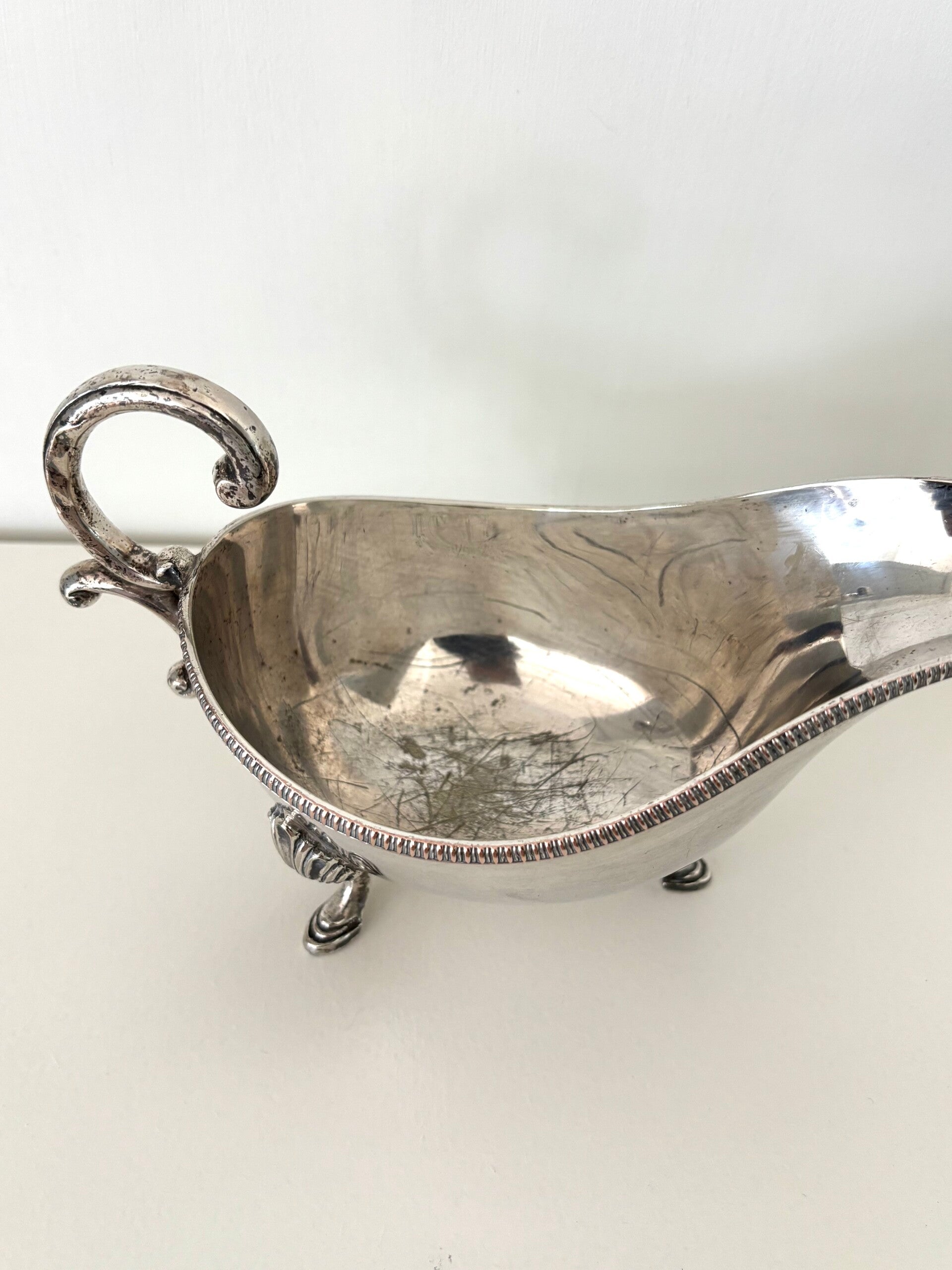 Silver-plated gravy boat EPNS, made in England. Classic design with an elegant look. Interior shows signs of use.