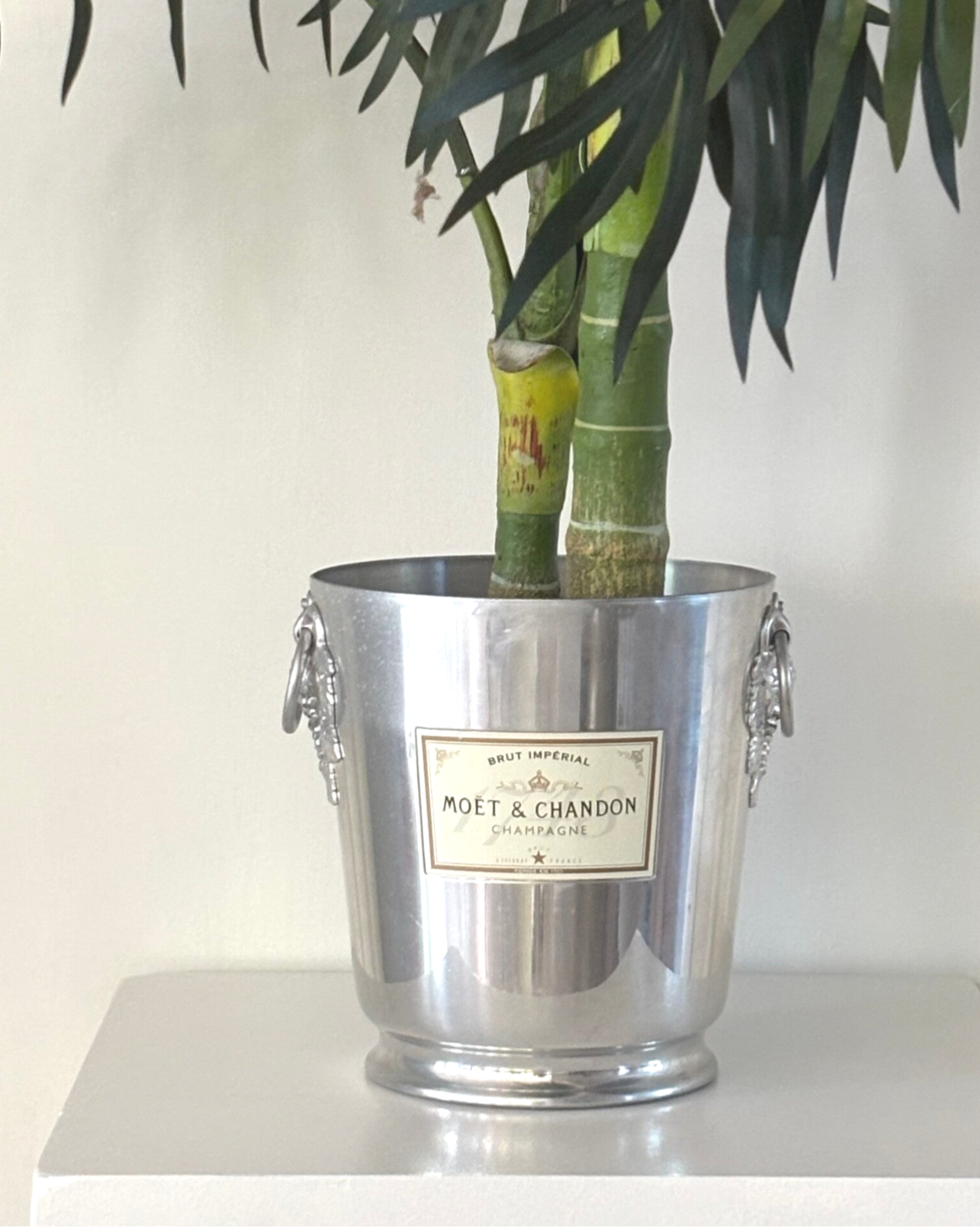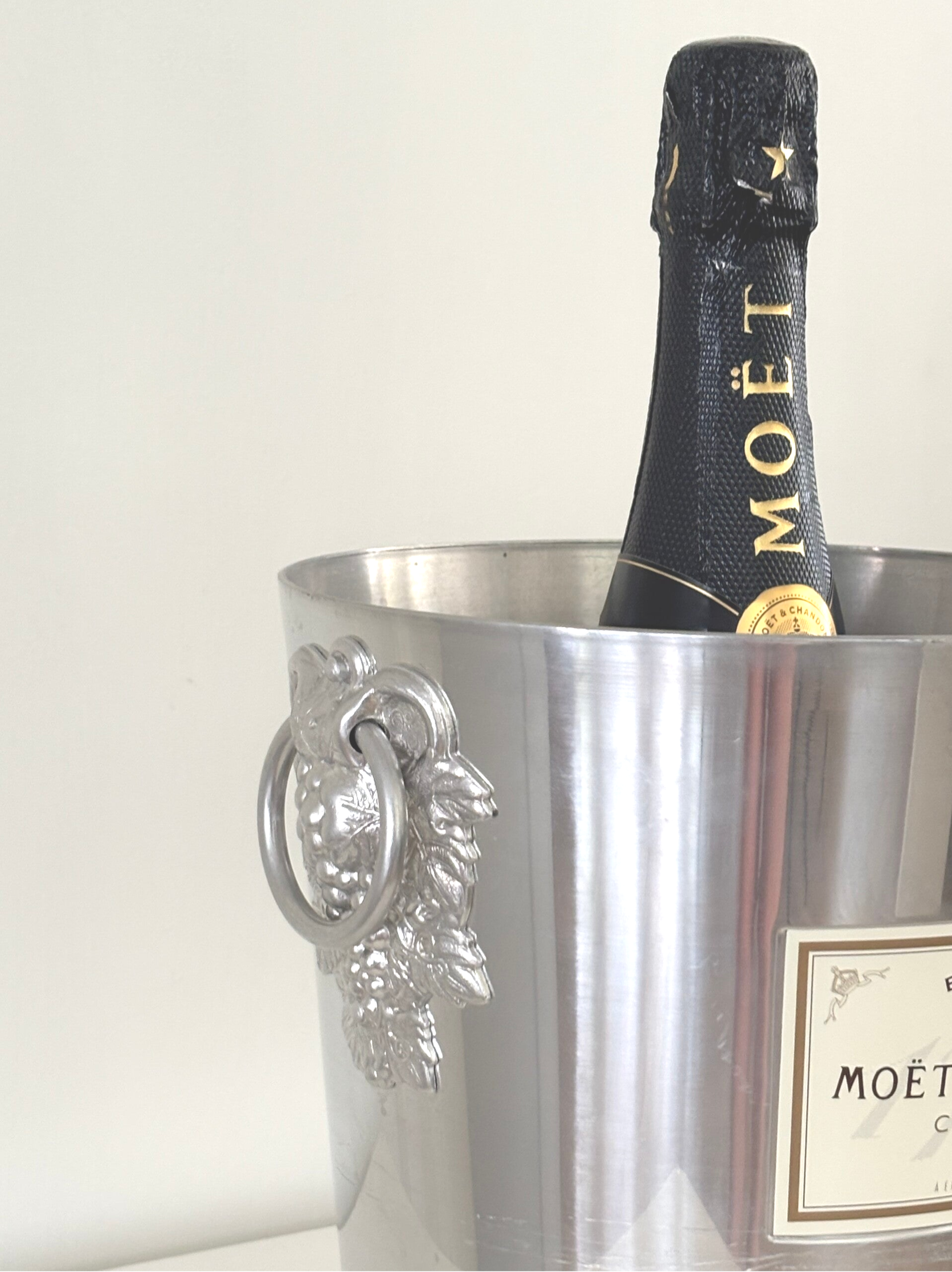 Champagnekoeler van Moët & Chandon met sierlijke druivenrank bij het handvat. Een iconisch en stijlvol item voor feestelijke momenten, perfect voor elke champagne- of wijnliefhebber.