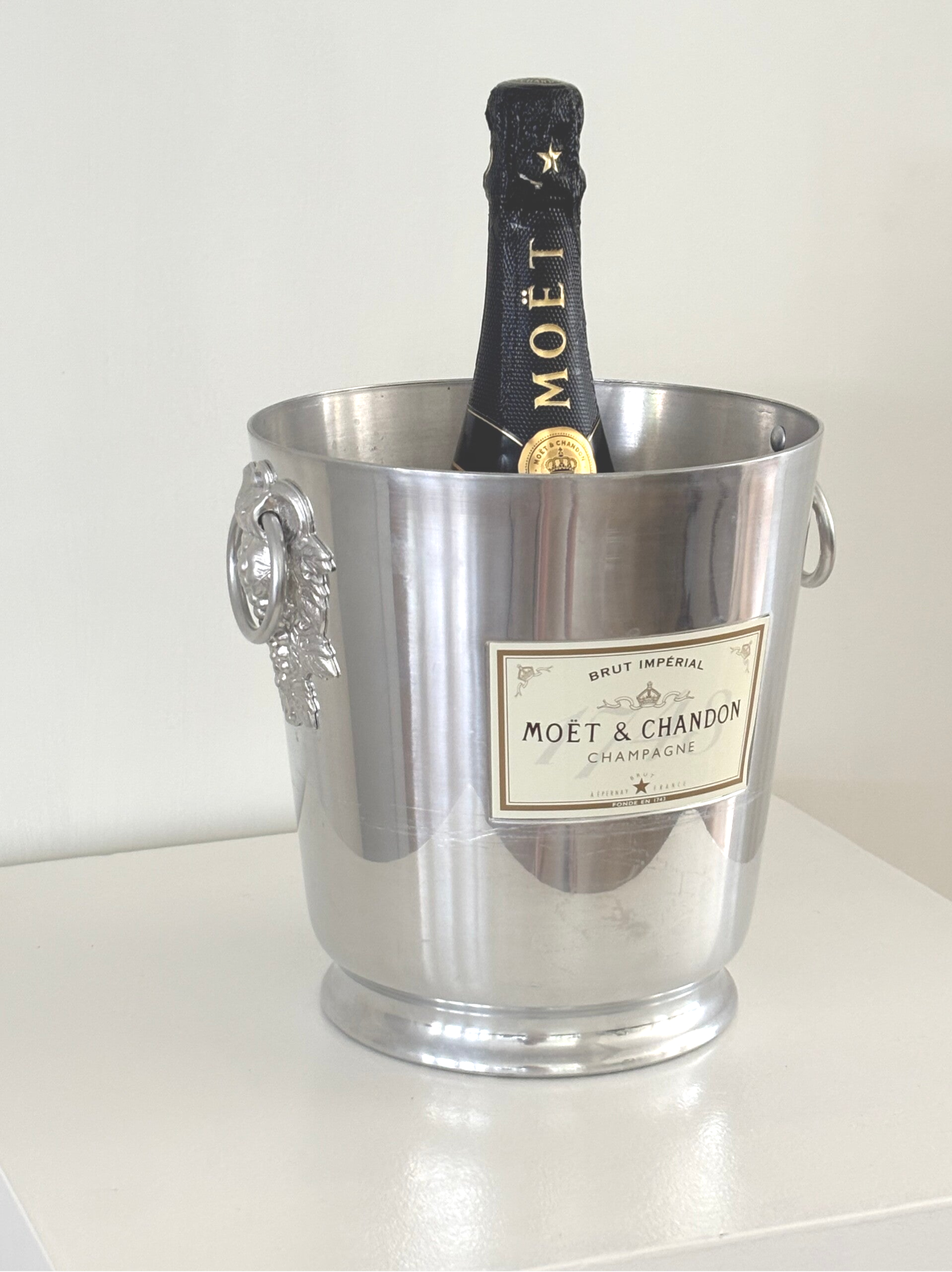 Moët & Chandon champagne cooler featuring an elegant grapevine detail on the handle. An iconic and stylish piece for festive occasions, perfect for any champagne or wine lover.