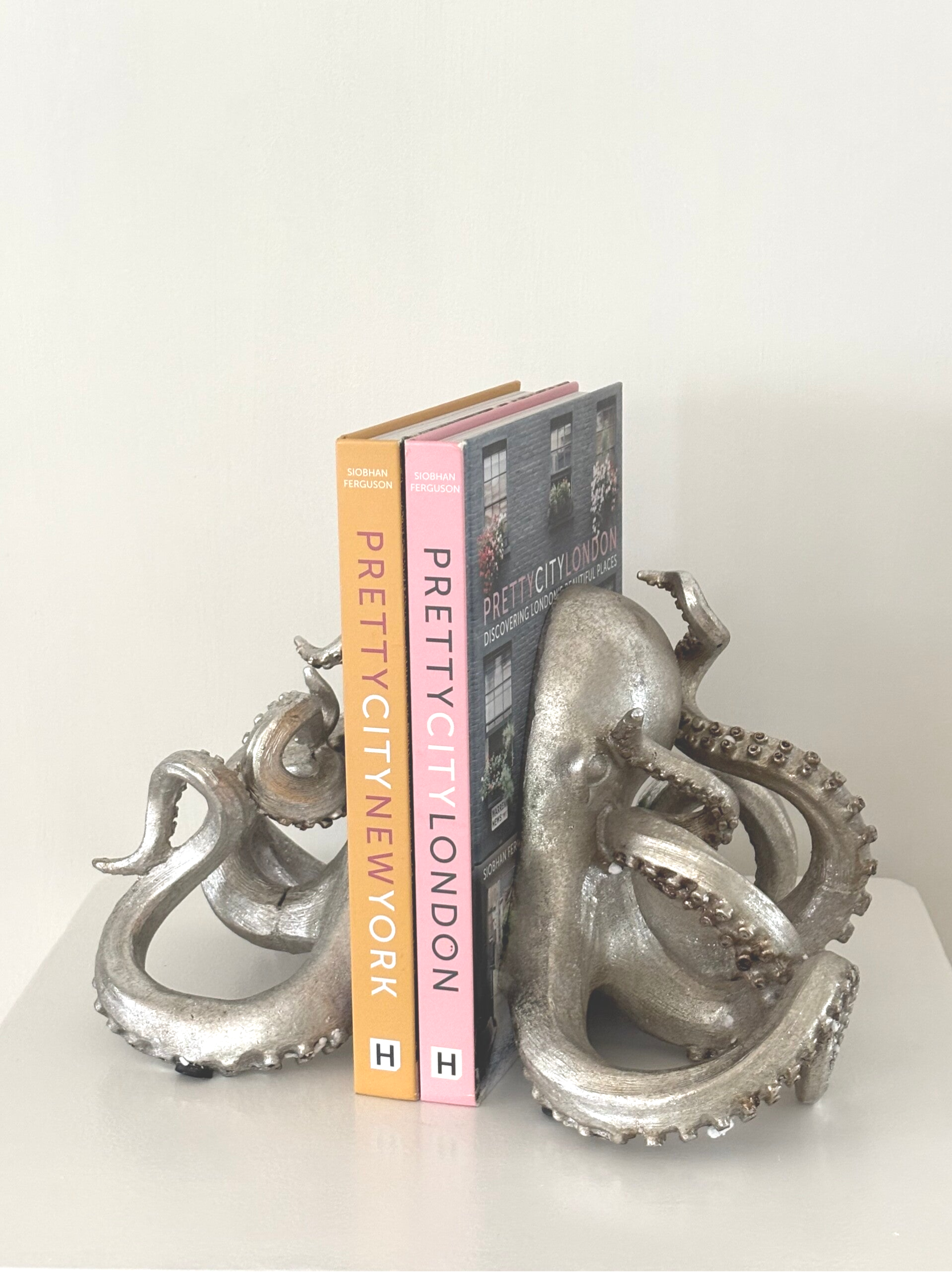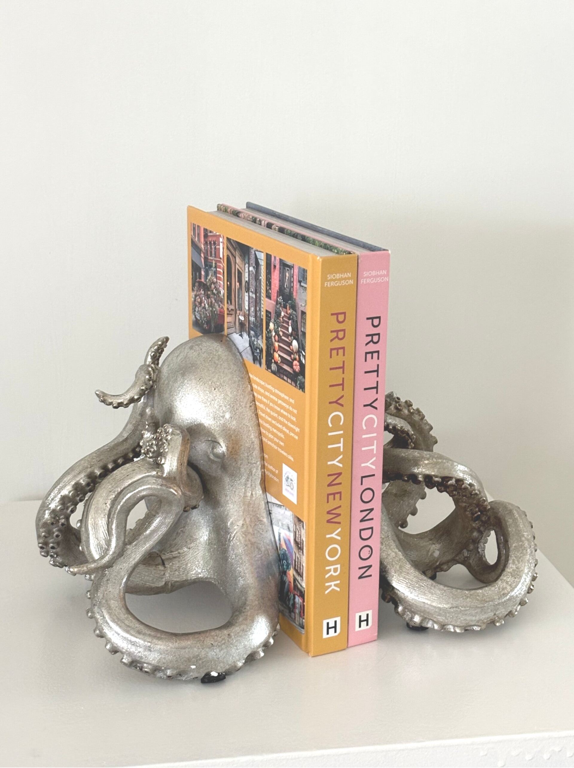 Elegante set boekensteunen in de vorm van een octopus. Een bijzonder decoratief en functioneel object dat stijl en karakter toevoegt aan elke boekenkast of studeerkamer. Hoogte: 20 cm.