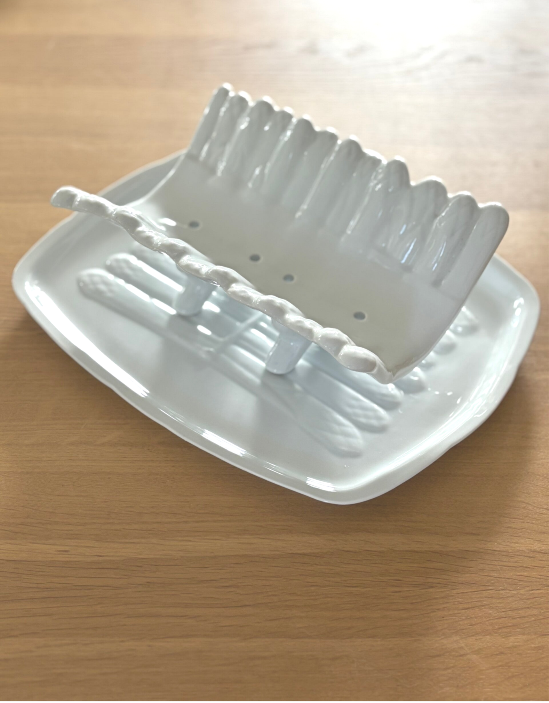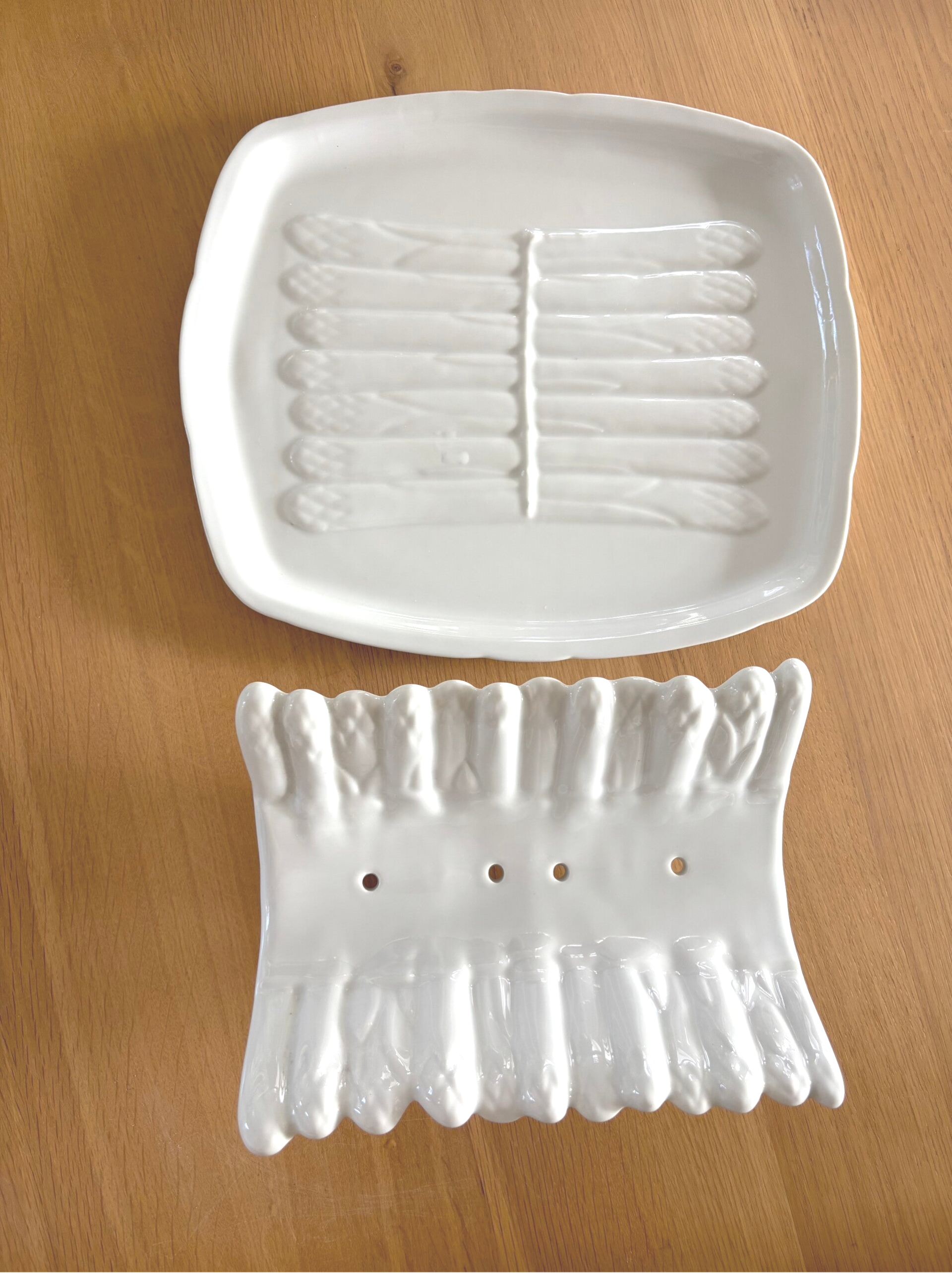 Keramische aspergeschaal met bijpassend groot onderbord. Een charmante en functionele set voor het stijlvol serveren van asperges en andere groentegerechten.