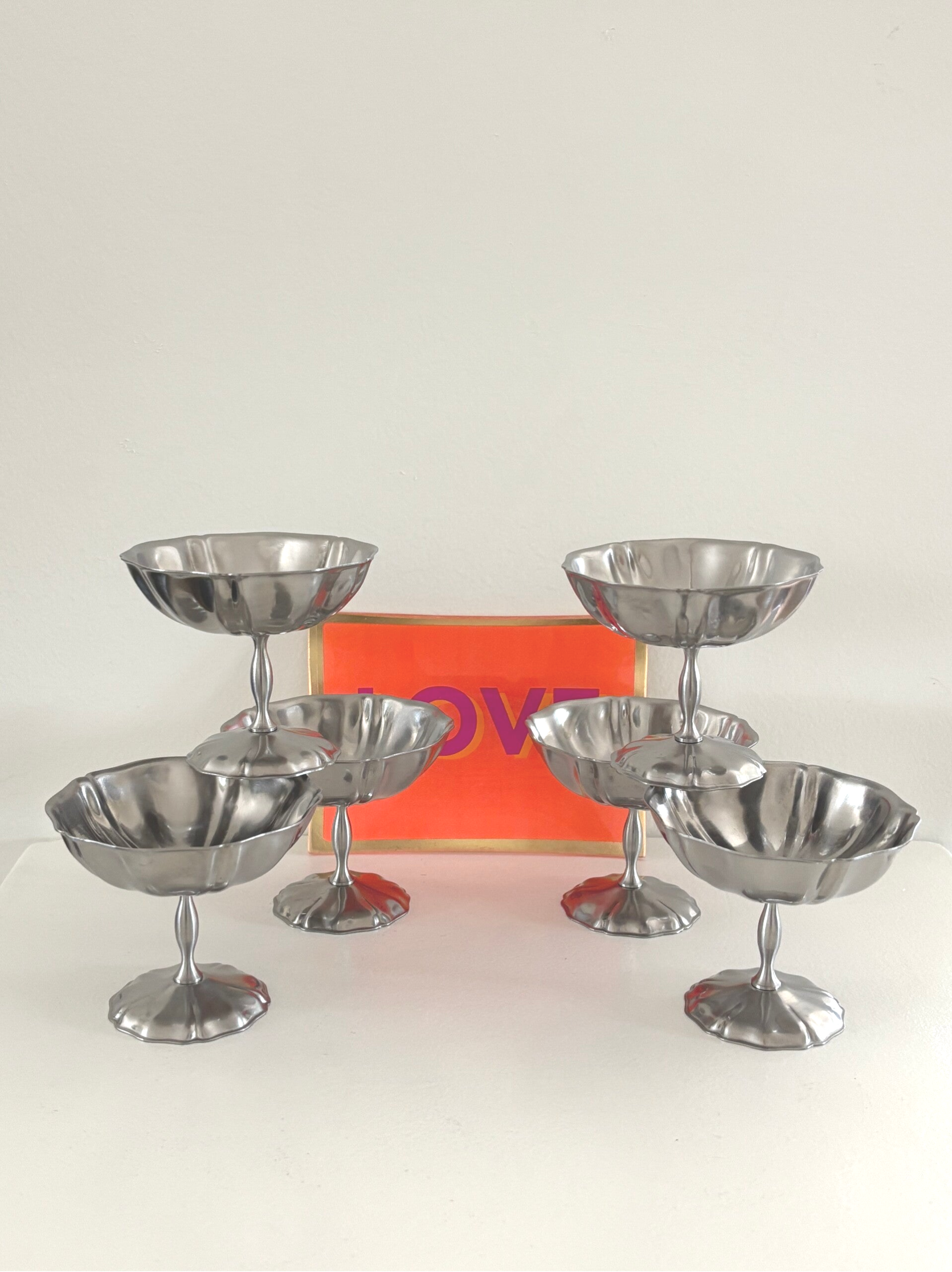 Set of 6 stainless steel dessert coupes. Timeless design, ideal for ice cream, fruit, or small desserts.