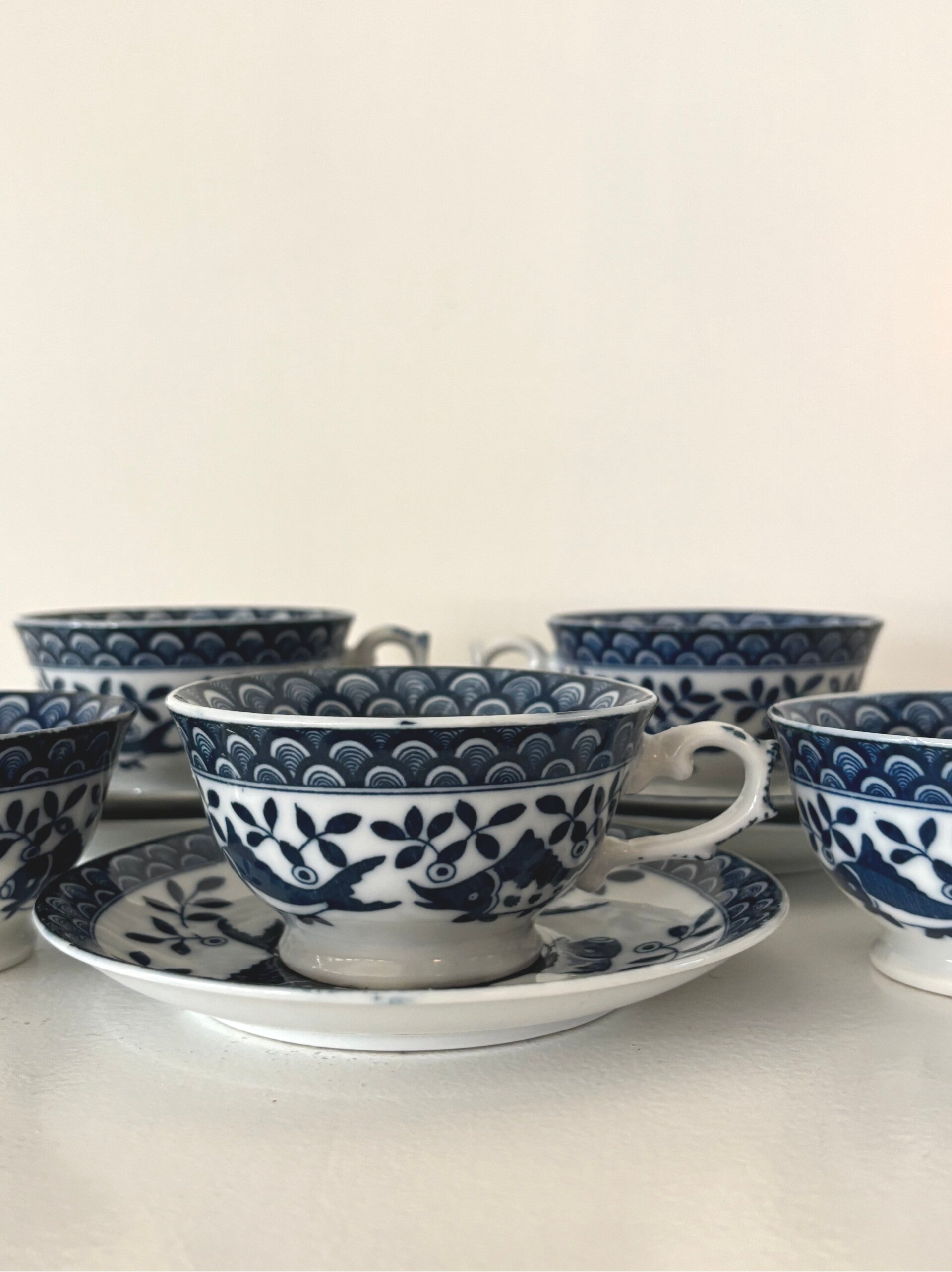 Set of 5 antique cups and saucers featuring a beautiful fish motif. An elegant and unique set.