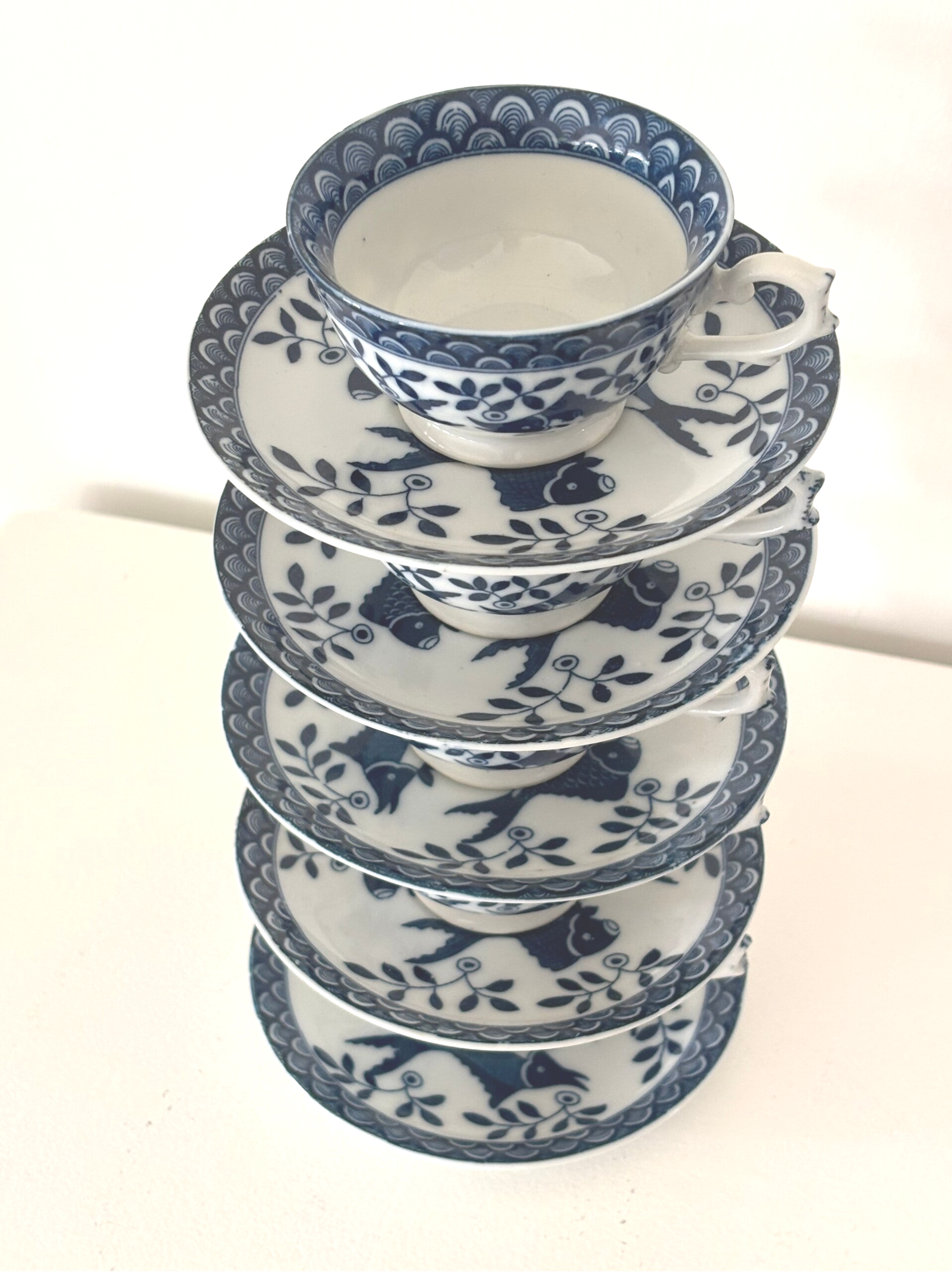 Set van 5 antieke kop en schotels met een fraai visdecor. Een elegante en bijzondere set.