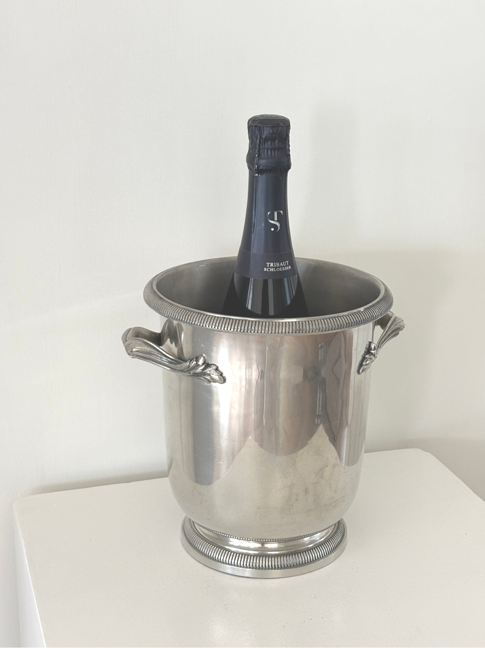 Champagne cooler by Les Etains du Marais. A heavy piece with fine detailing and a classic look. In beautiful vintage condition. Height: 21.5 cm, diameter: 19.5 cm.