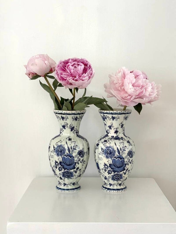 Vintage Delft Hollanda Handwerk garniture set with two vases (24 cm) and one lidded vase (34 cm). Timeless and elegant, a great match for both classic and modern interiors.