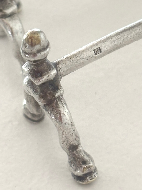 Set of 7 stunning marked, handmade silver-plated knife rests from the 1920s. Unique model with goat’s hoof-shaped ends. Marked "BB". Length: 9.3 cm.