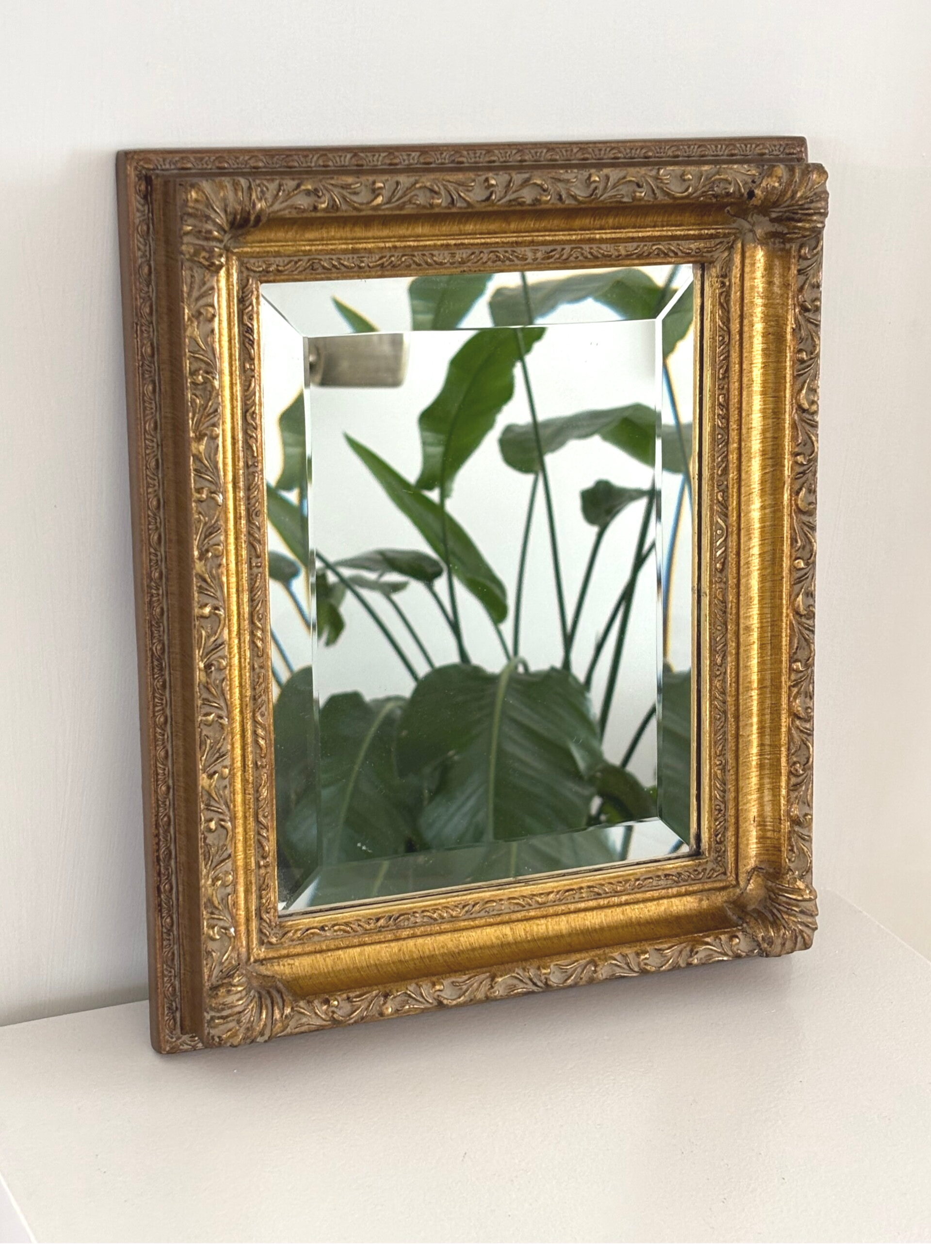 Vintage mirror with gold-colored frame and beveled glass. In good vintage condition. Dimensions: 33 x 27.5 cm. Two available.
