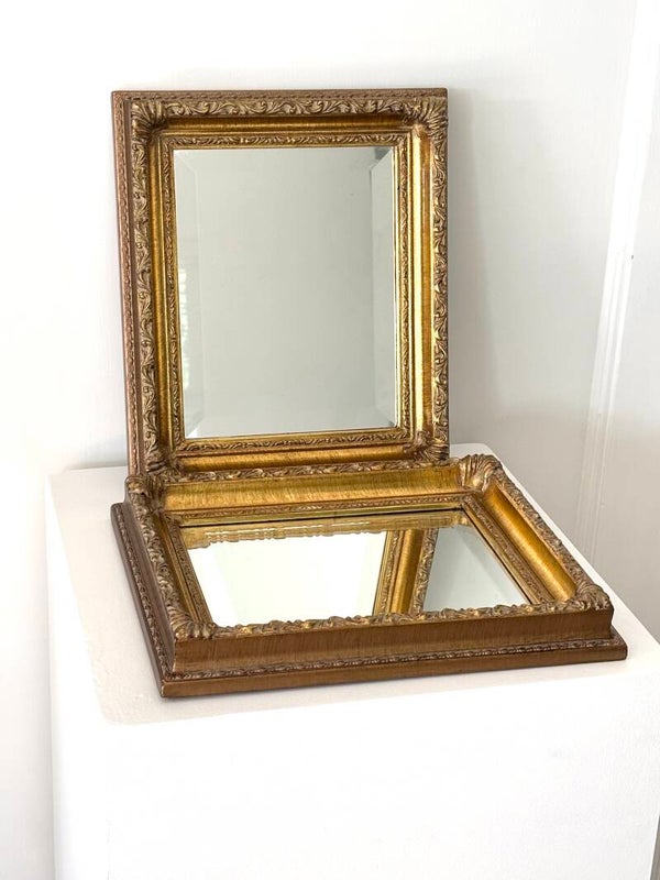 Vintage spiegel met goudkleurige lijst en geslepen glas. In goede vintage staat. Afmetingen: 33 x 27,5 cm. Er zijn twee spiegels beschikbaar.