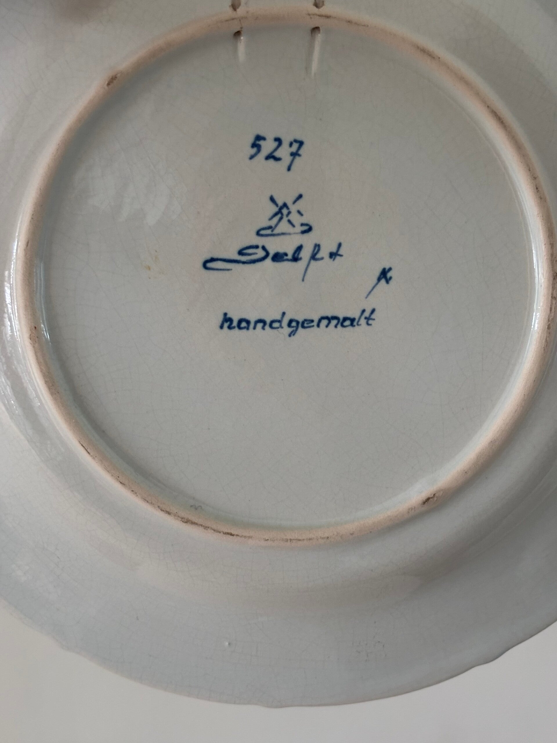 Hand-painted Delft Blue wall plate with a classic motif. In good vintage condition. Diameter: 27 cm.