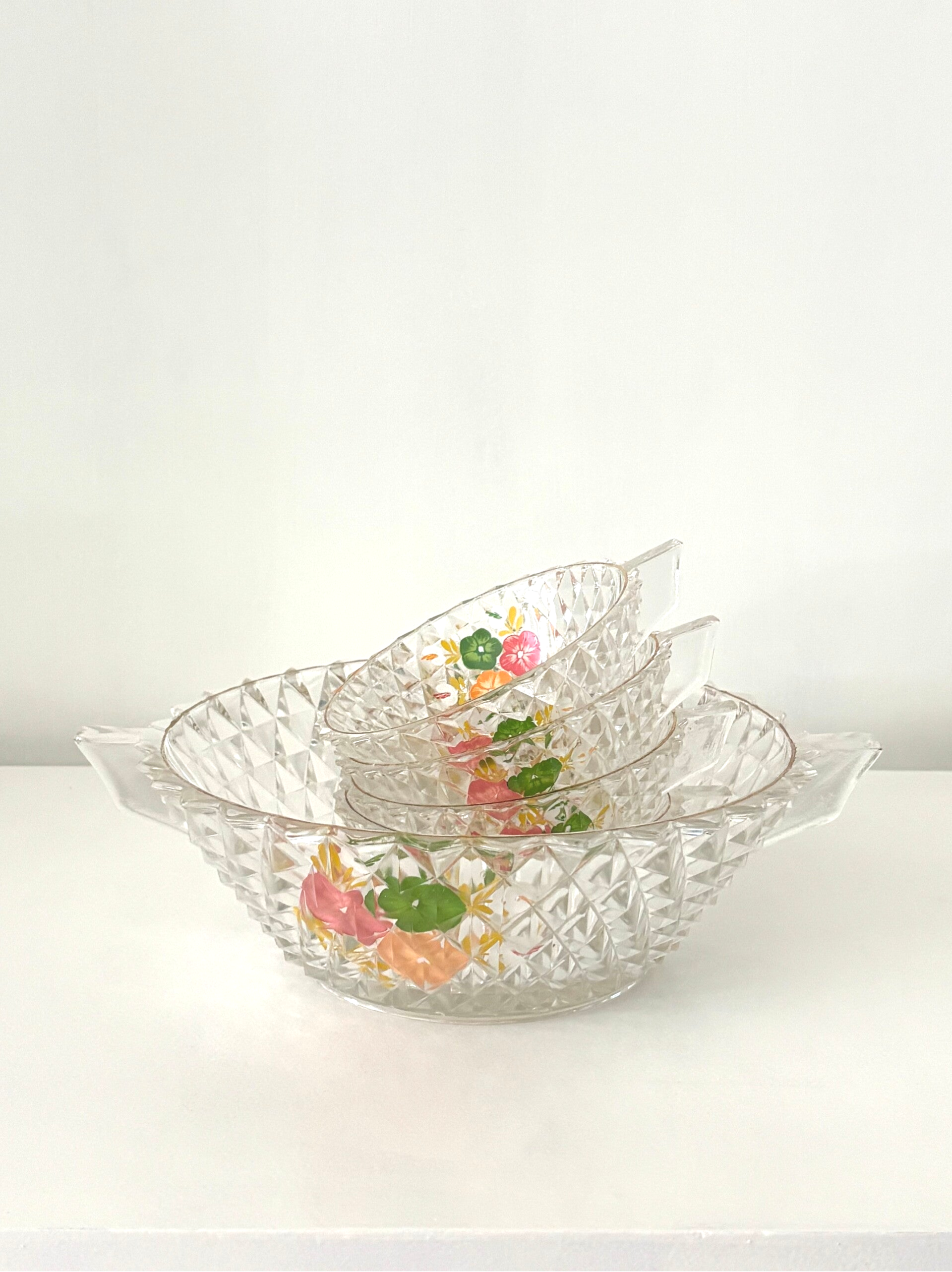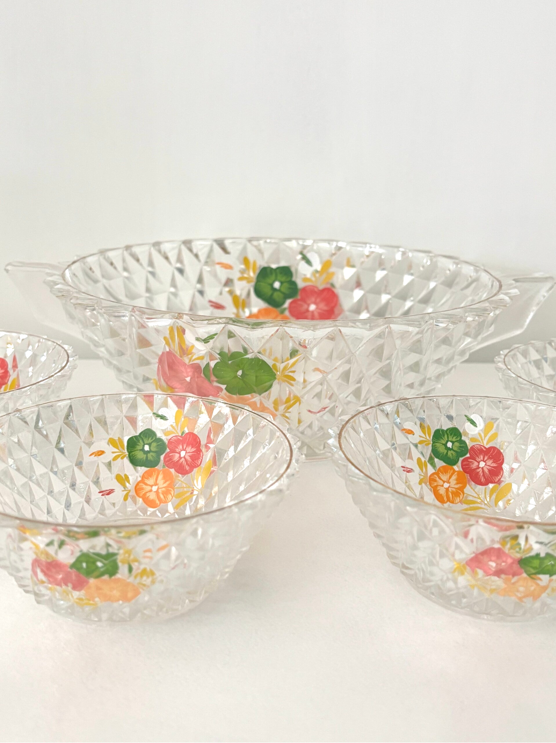 Hand-painted pressed glass punch or dessert bowl by Lubiana Italy with floral design (Ø 23 cm), including 4 matching bowls (Ø 12 cm). 1960s, cheerful and decorative.