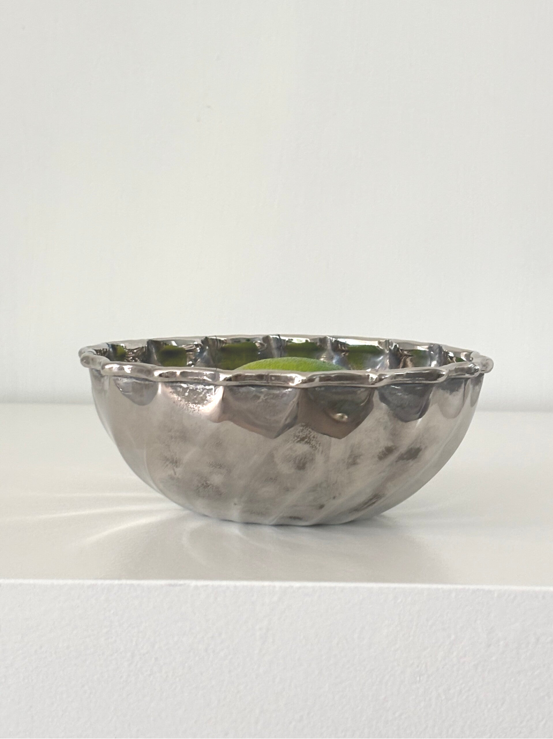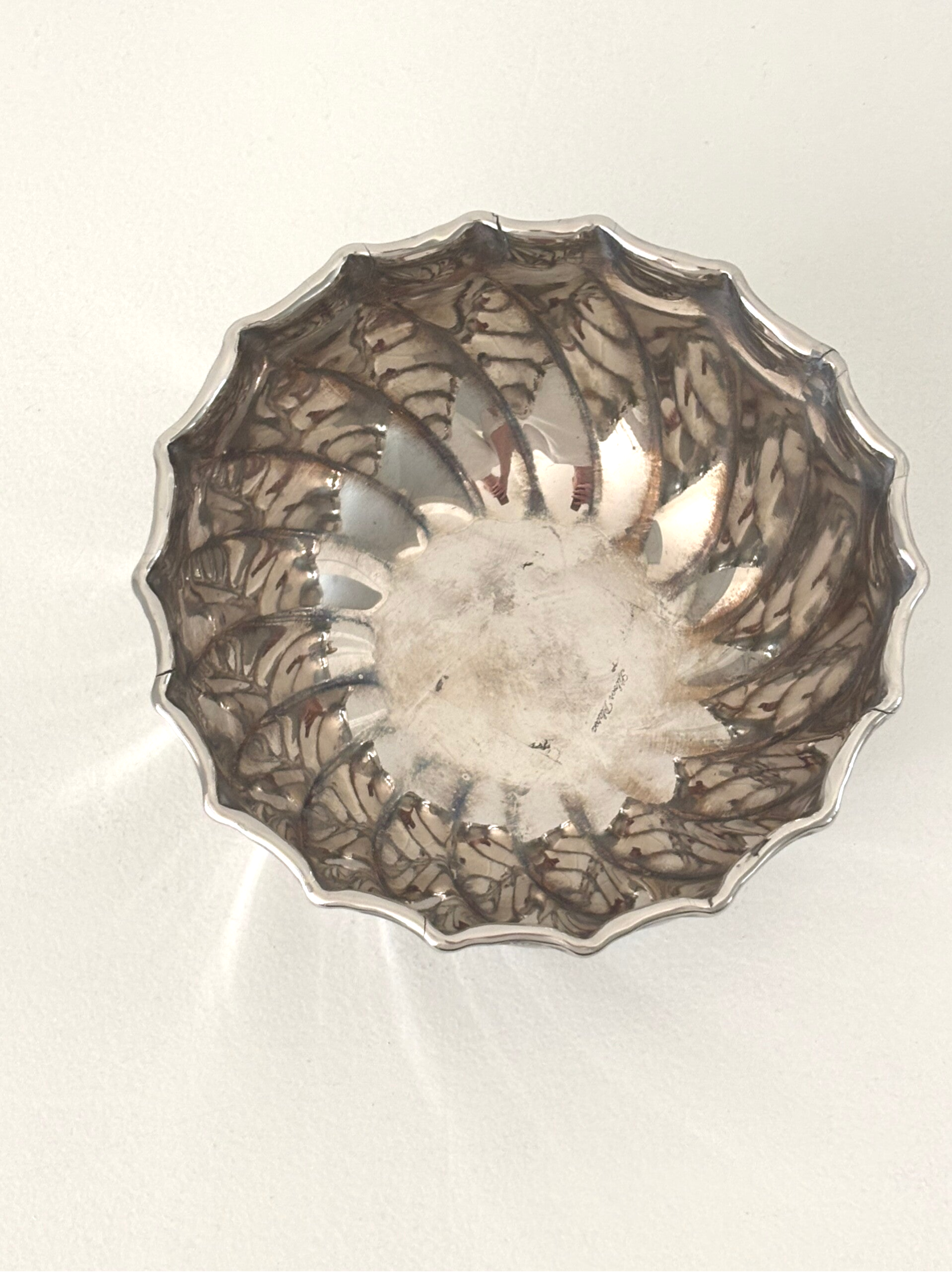 Verzilverd schaaltje met elegante gedraaide look. Een stijlvol item voor bonbons, sieraden of kleine hapjes. Diameter: 14 cm.