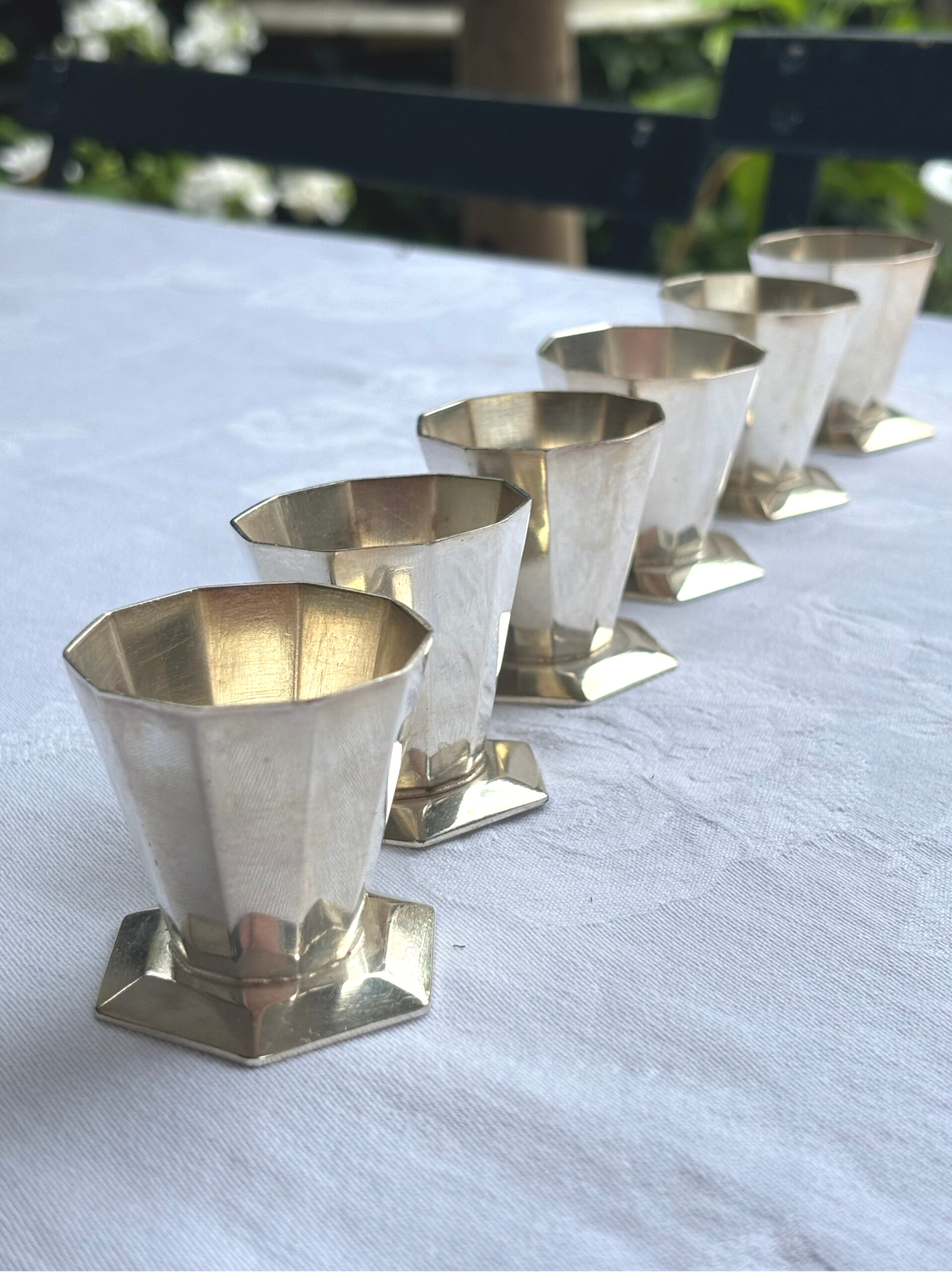 Bijzondere set van verzilverde design eierdopjes op een bijpassende onderschaal. Art deco stijl en gemerkt aan de onderzijde. Hoogte: 4,5 cm. Een echte eyecatcher op tafel.