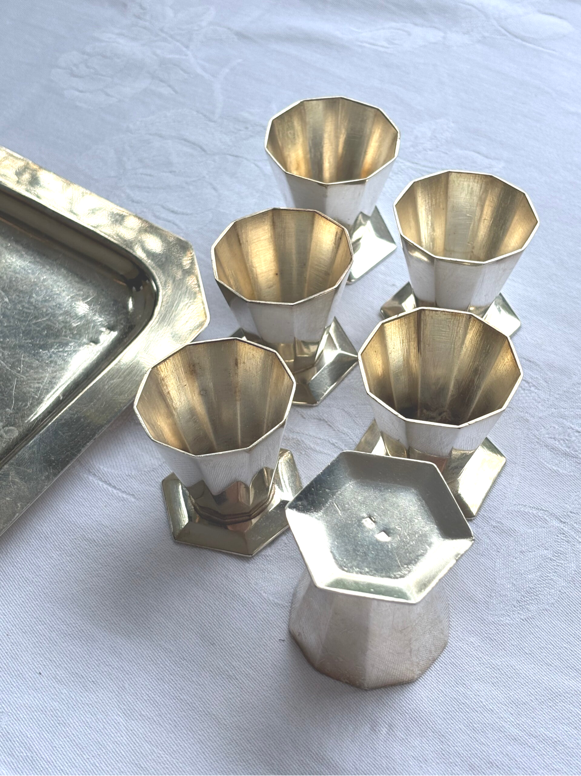 Unique set of silver-plated design egg cups with matching tray. Art Deco style and marked on the bottom. Height: 4.5 cm. A real table showpiece.