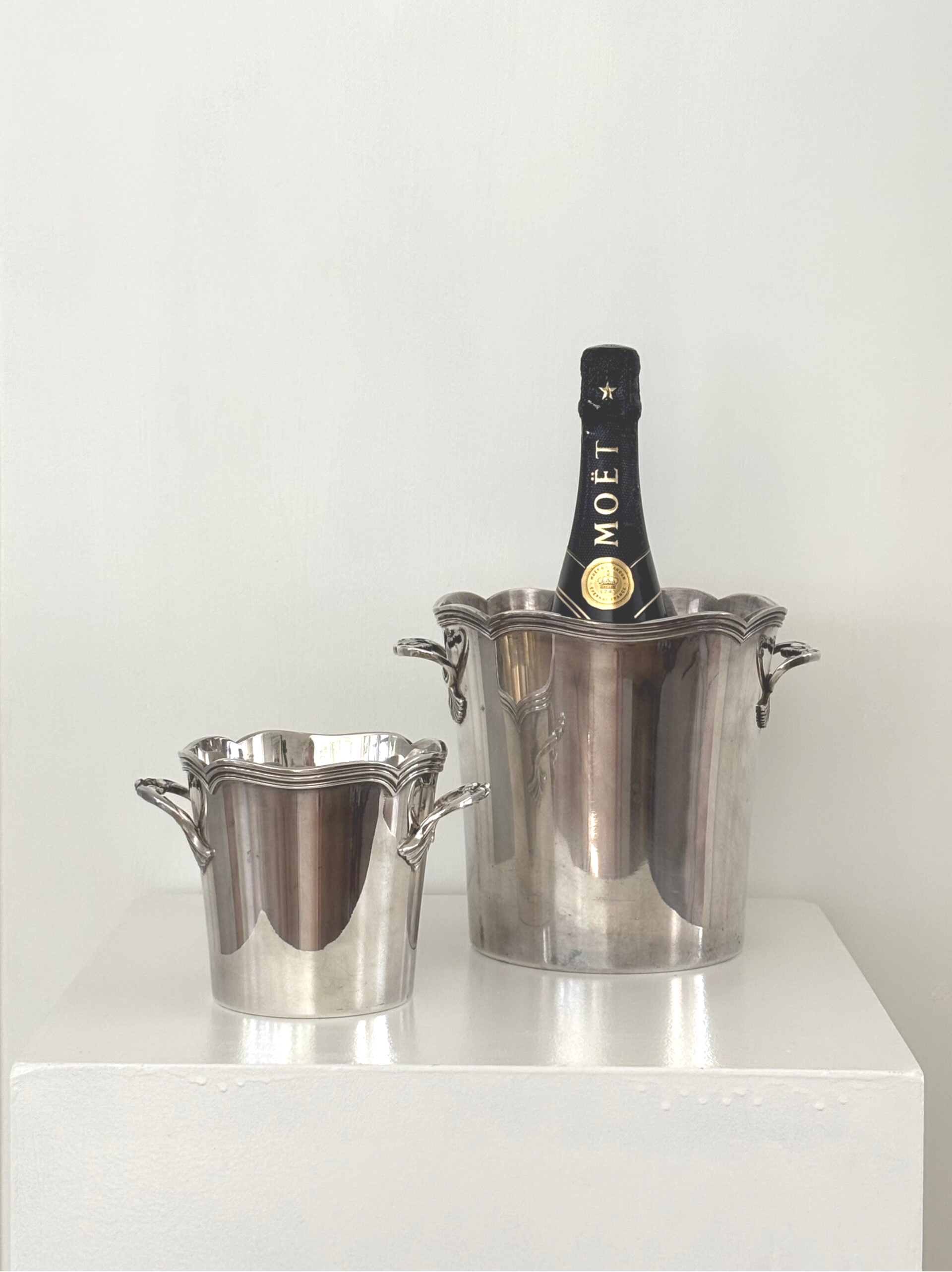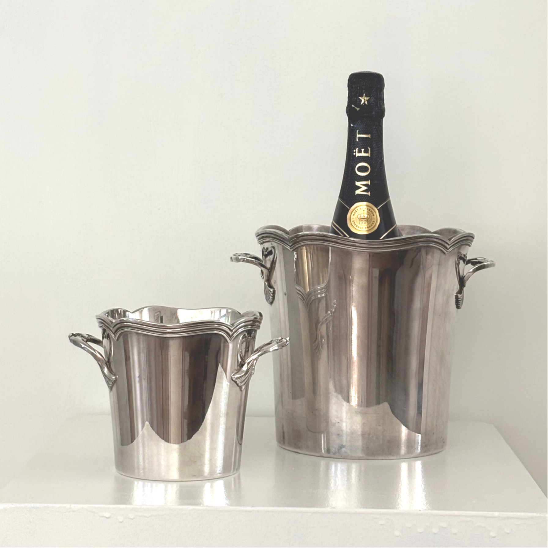 Beautiful silver-plated set consisting of a Champagne cooler and matching ice bucket. Heavy quality with elegant handle details. Both marked on the bottom. Cooler height: 18.5 cm, diameter: 19 cm. Ice bucket height: 12 cm, diameter: 13 cm.
