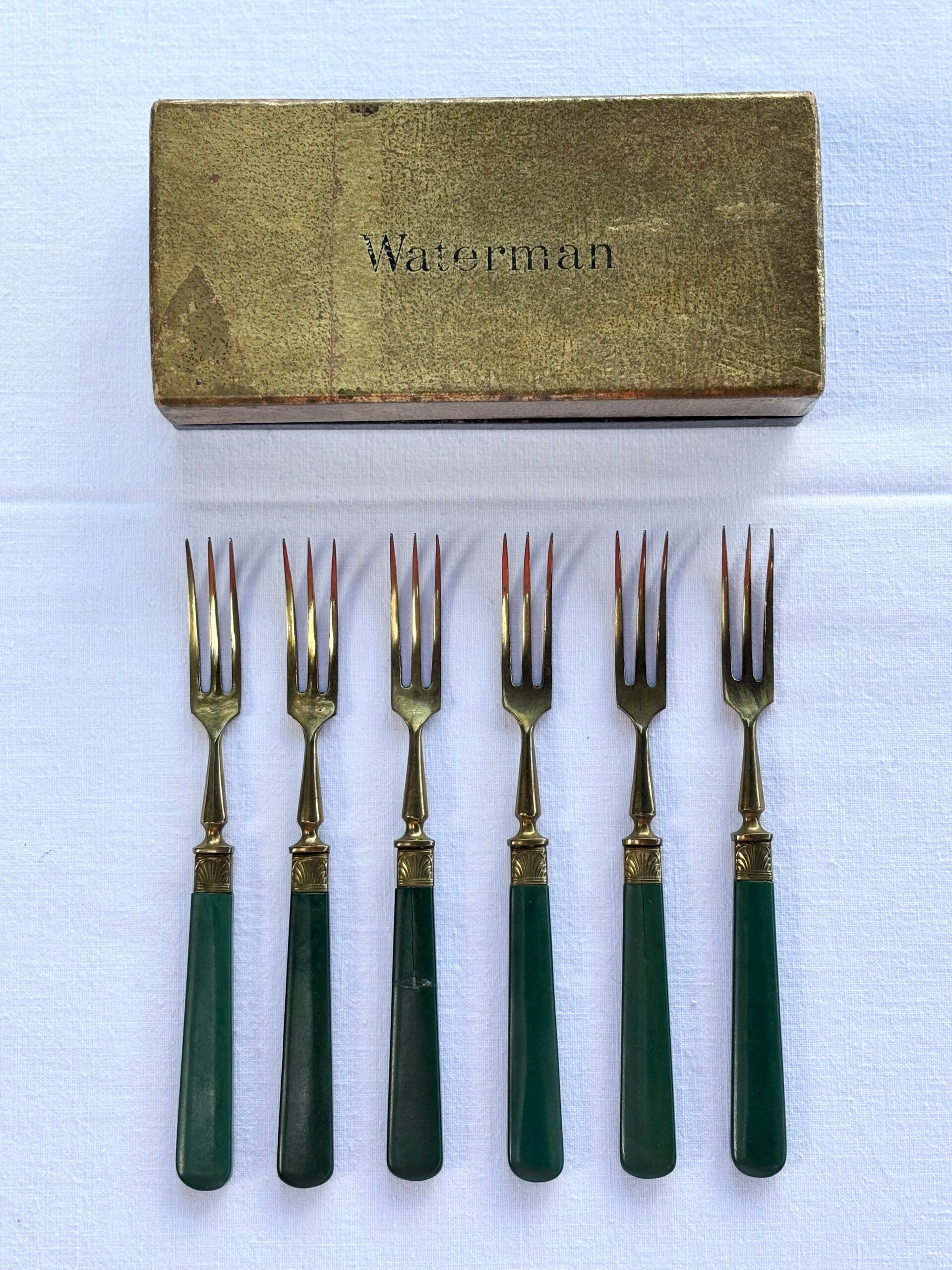 Set van 6 vintage gebaksvorkjes uit Frankrijk. Elegant en tijdloos, perfect voor bij de koffie of thee.