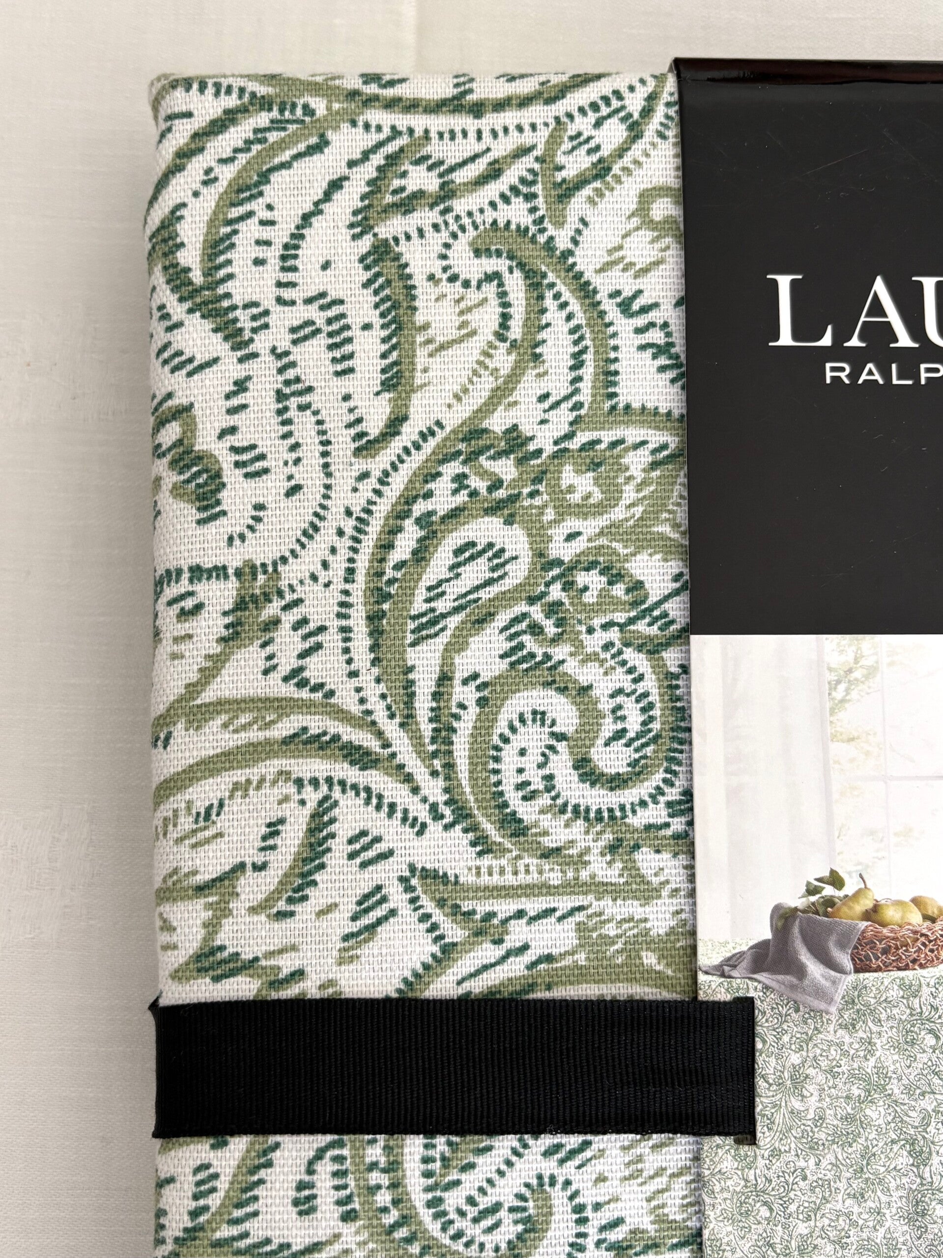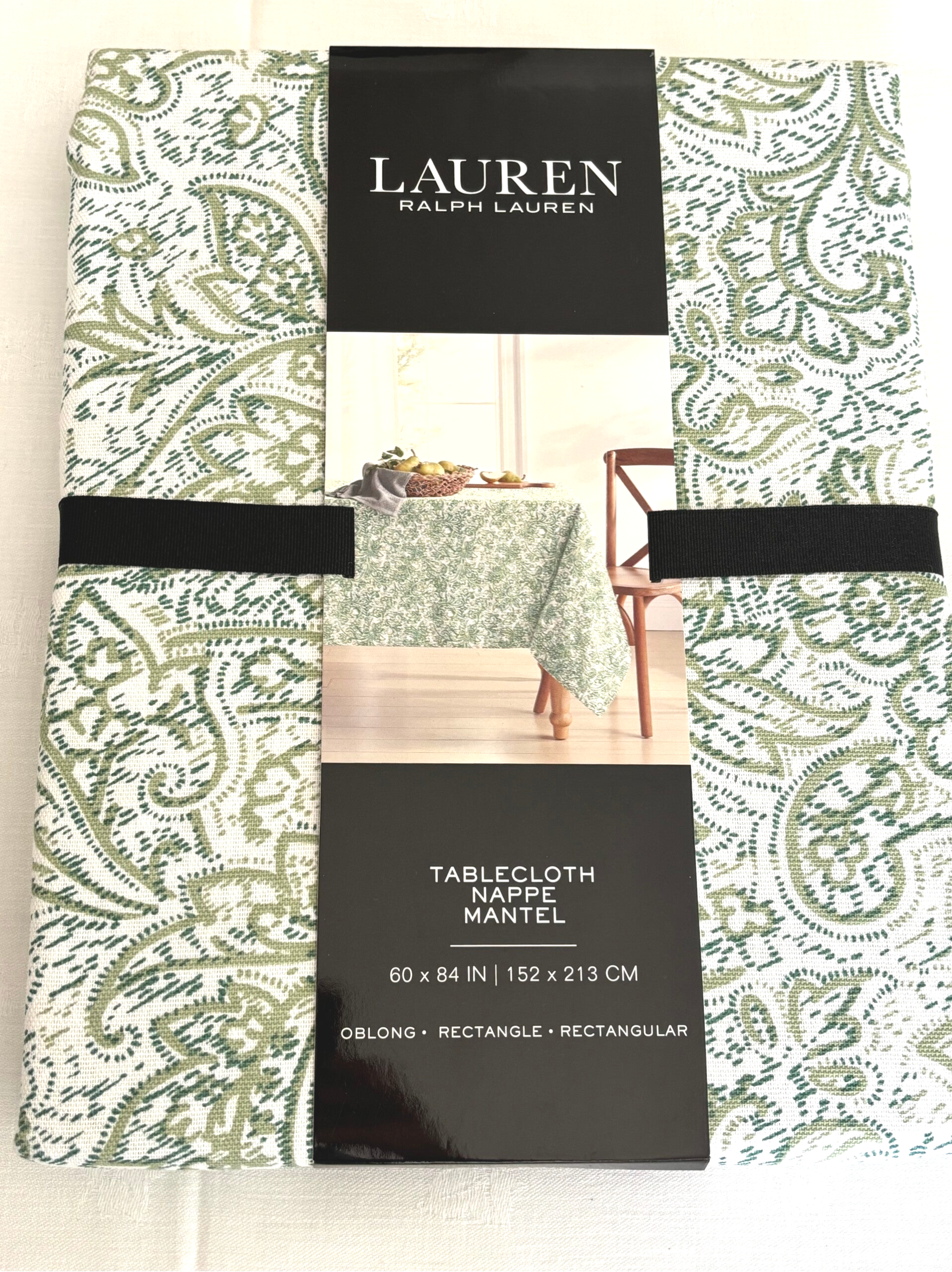 Beautiful Ralph Lauren tablecloth in a green/white color. Made of durable quality, ideal for an elegant table setting. Dimensions: 152 x 213 cm.