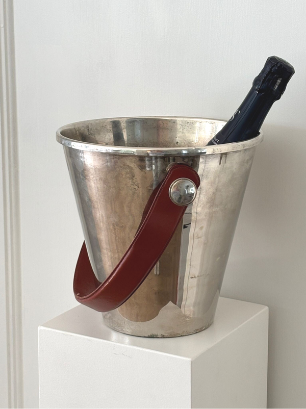 Elegant Champagne cooler with buffalo leather handle from the MANHATTAN series by Flamant Home Interiors. Finely crafted and a true eye-catcher for any setting. Height: 22 cm, diameter: 23 cm.