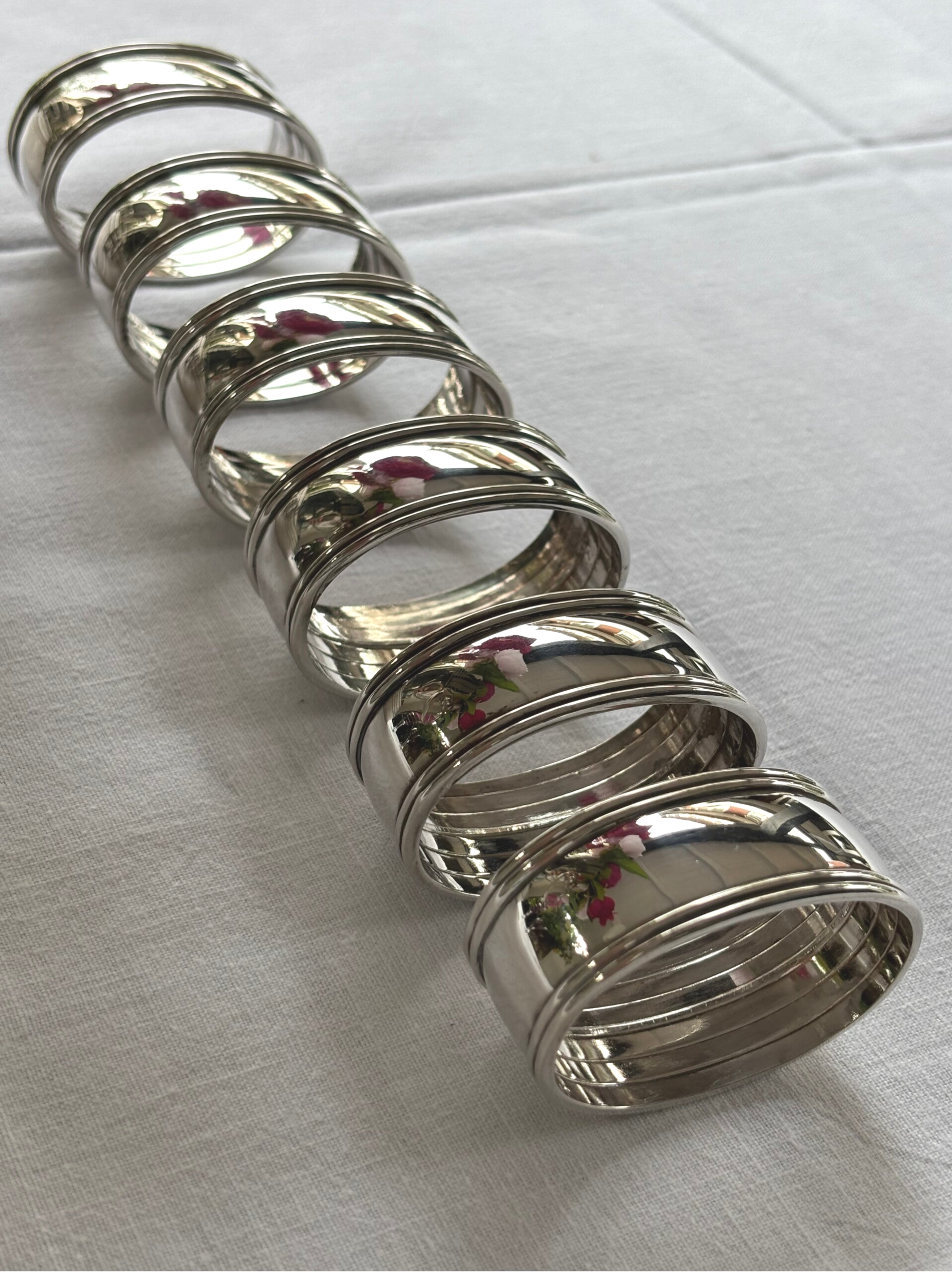 Set van 6 verzilverde servetringen met tijdloze elegantie. Een klassieke toevoeging aan elke tafelsetting. Afmetingen: 5,5 x 3,7 cm.