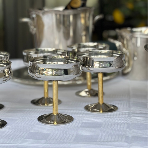 Set van 6 zilver/goudkleurige dessertcoupes van INOX, made in Italy. Mooie gebruikte staat, strak design. Hoogte 11 cm.