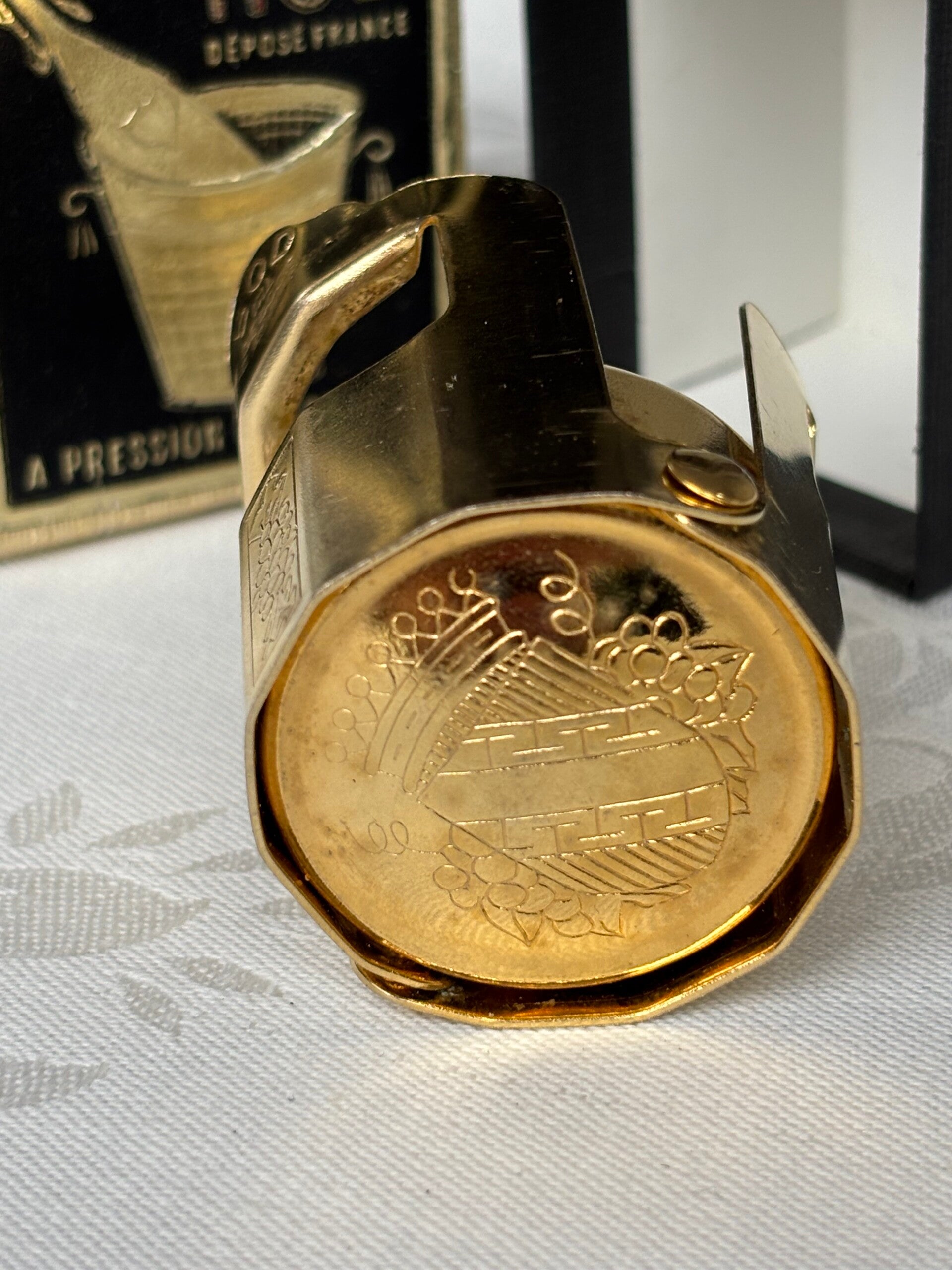 Champagne stopper by Bouchon à Champagne Automatique ROD Déposé France. Maintains constant pressure.