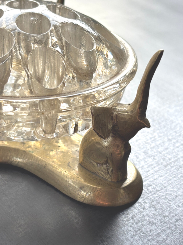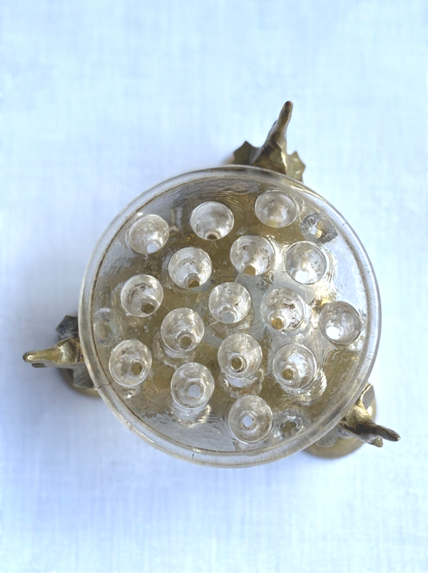 Old pique-fleur with brass holder and glass inlay. Dimensions: 13 x 13 cm. A unique decorative piece.